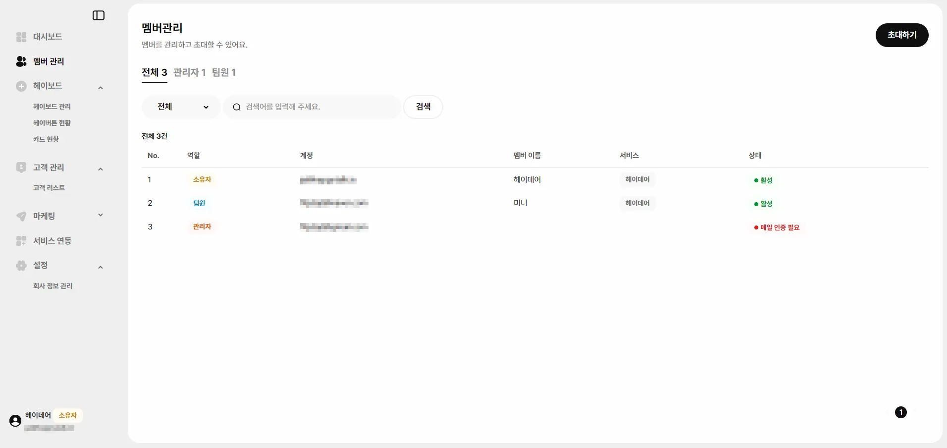 이 후 [멤버관리>초대하기]기능을 통해 관리자와 팀원을 초대하고 함께 헤이데어 관리가 가능해요.