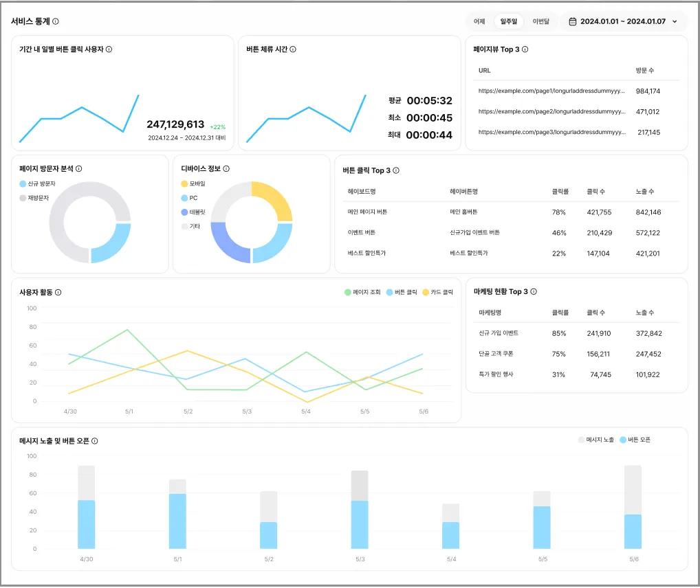 방문자 수, 콘텐츠 클릭률, 메시지 반응률 등 다양한 통계를 실시간으로 제공해요.