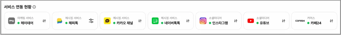 현재 연동되고 있는 서비스들을 보여주며, 설정 아이콘을 눌러 해당 서비스 연동 페이지로 바로 이동 가능해요.