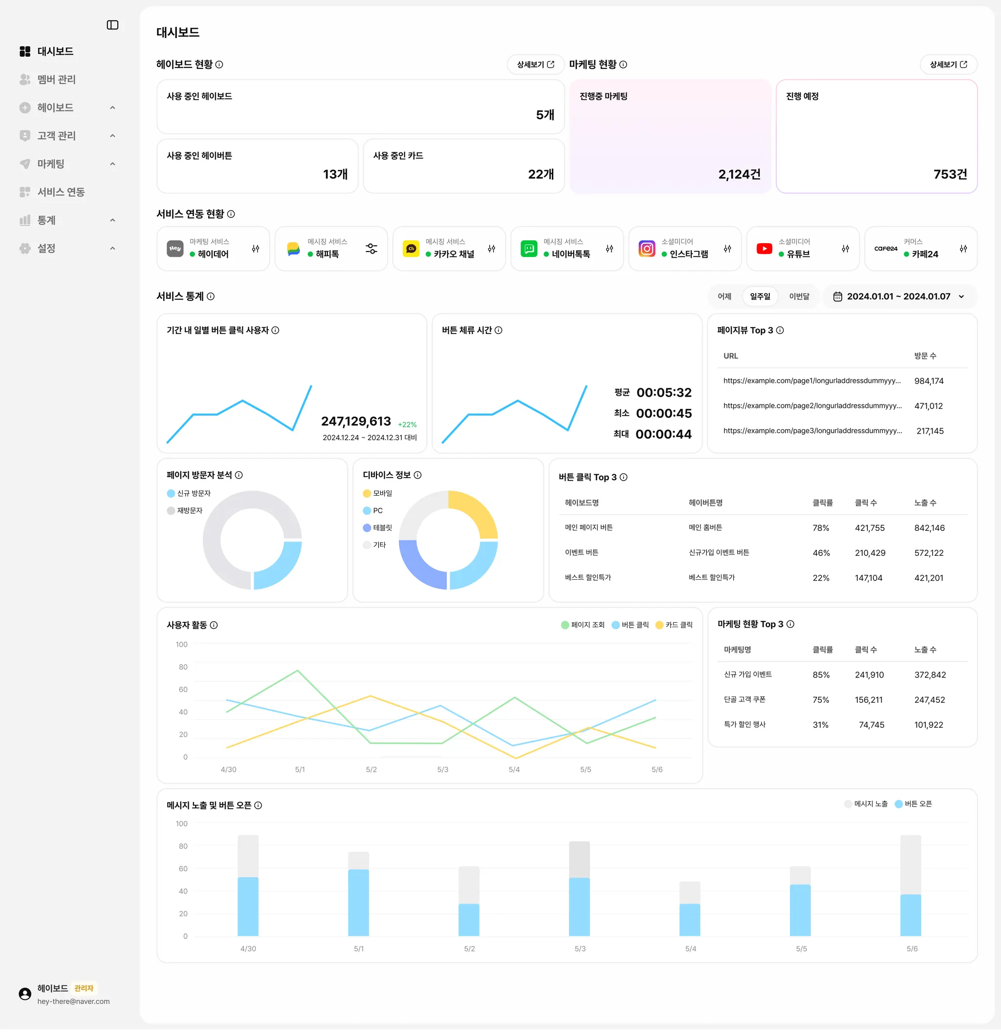 대시보드에서는 헤이데어를 통해 고객 데이터를 분석하여 헤이보드와 [헤이버튼/카드] 사용 통계, 마케팅 통계 등 다양한 서비스 통계를 제공하고 있어요.