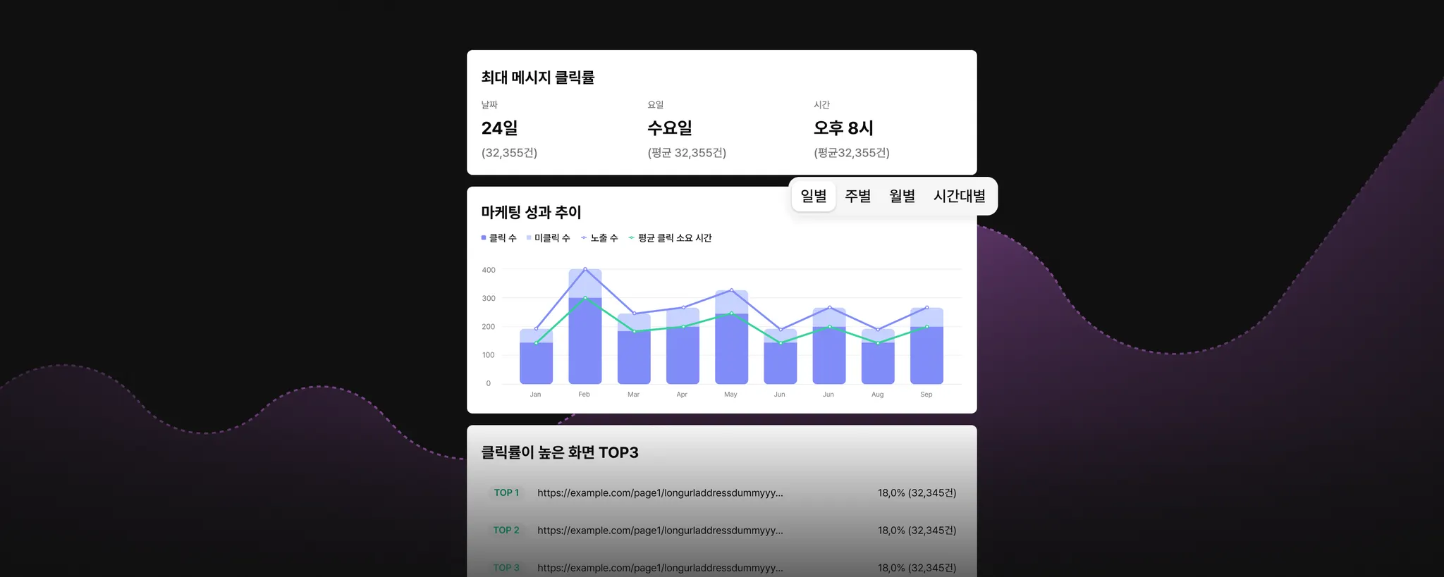 [일/주/월별/시간대별] 마케팅 메시지의 [노출 수]와 [클릭 수], [평균 클릭 소요 시간]을 쉽게 도표로 파악할 수 있어요.