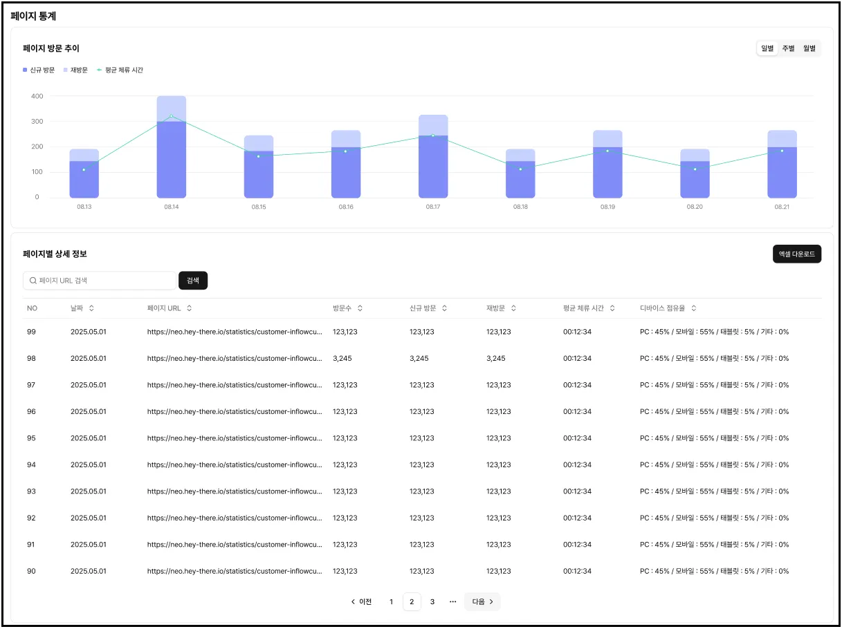 페이지별 상세 정보를 엑셀로 다운받아 관리할 수 있어요.