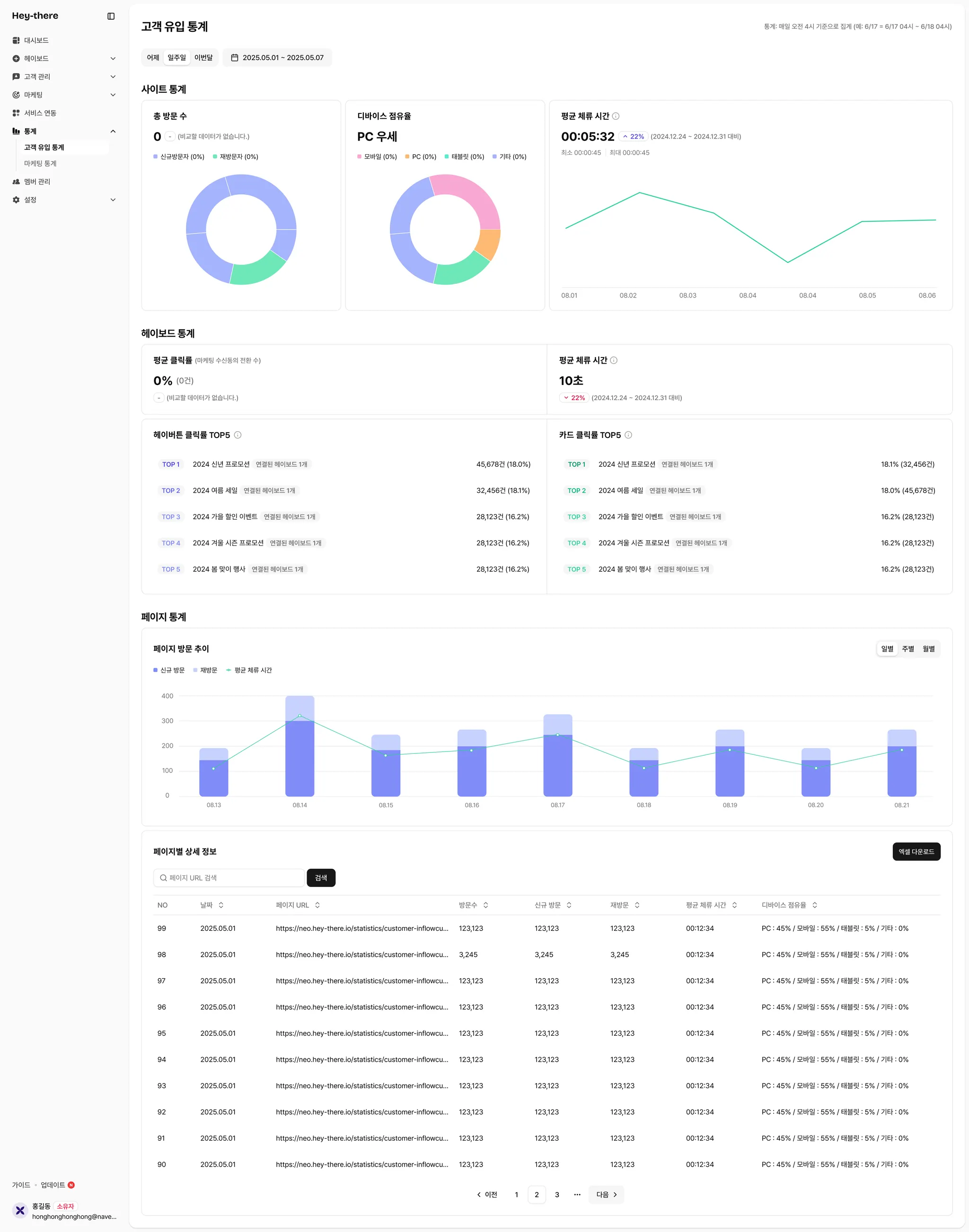 헤이데어에서 제공하는 헤이보드와 마케팅 기능을 통해 운영 중 사이트에 어떻게 방문하고 머무는지, 어떤 콘텐츠에 관심을 보였는지를 한눈에 알 수 있는 통계 리포트예요.