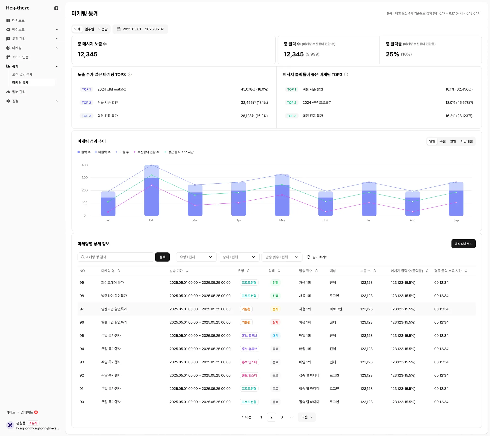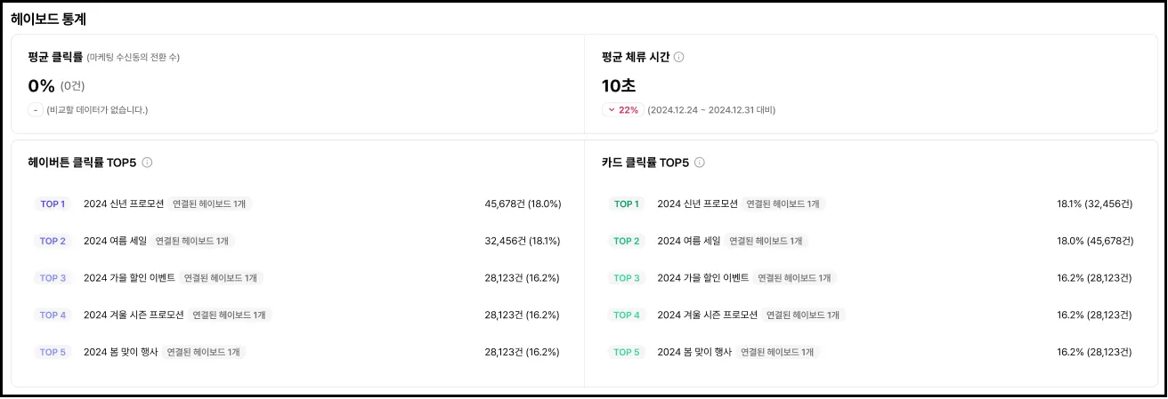 총 메시지 노출 수, 총 클릭 수, 총 클릭률을 통해 마케팅 성과를 확인할 수 있어요.