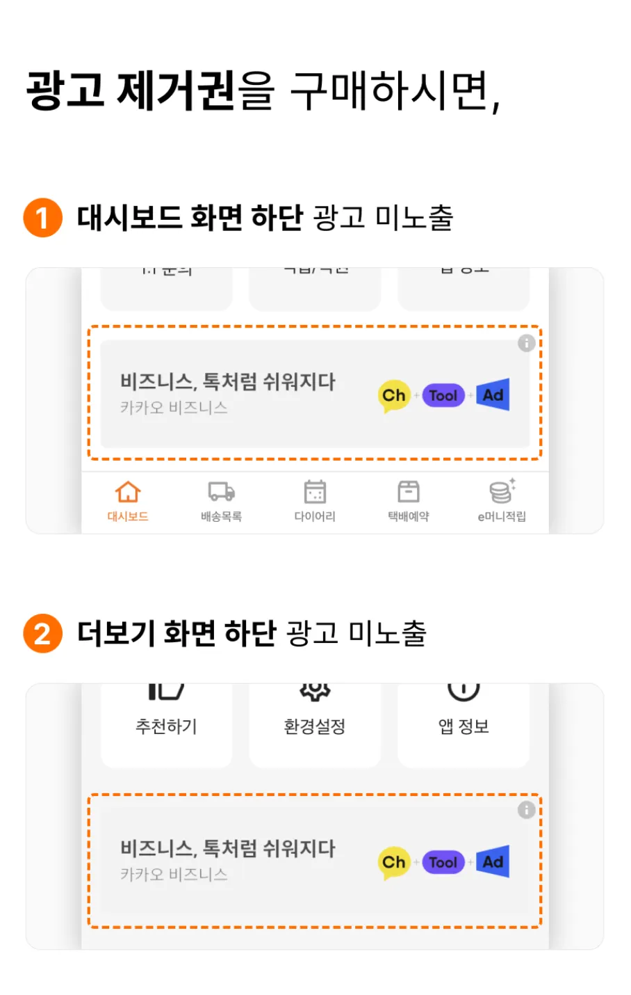 하단 메뉴에서 더보기를 눌러주시면 더보기 화면 하단 부분에서 '광고제거' 메뉴를 확인하실 수 있습니다.