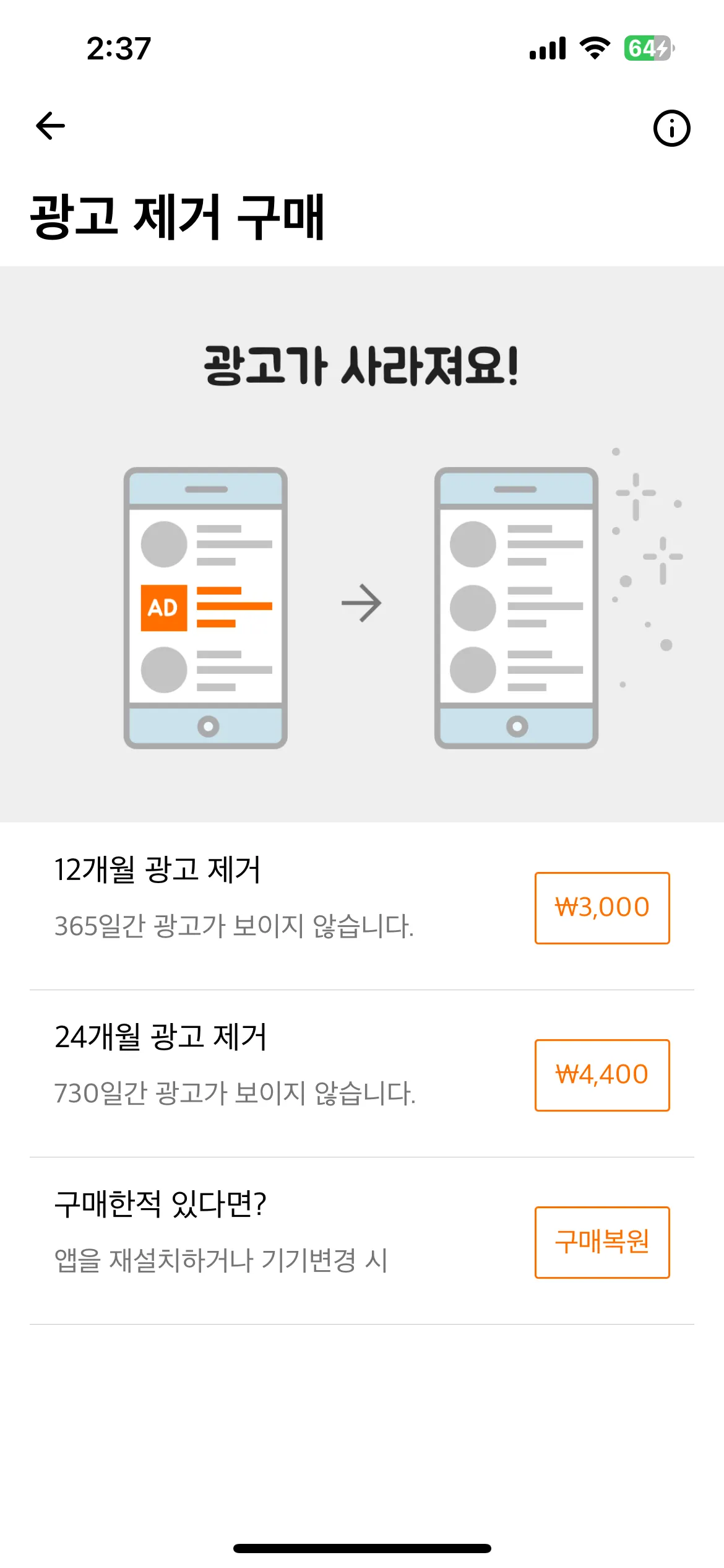 2년간 광고 제거 : 4,400원(iOS) / 3,000원(Andorid)