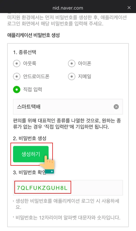 비밀번호 생성하기 버튼을 탭 하면, 그 아래 생성된 비밀번호를 확인하실 수 있습니다.