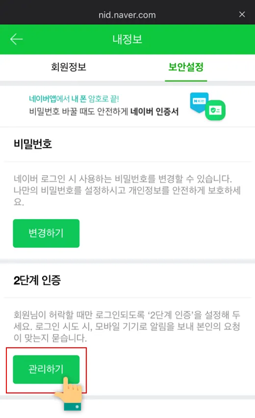 4. 2단계 인증 부분의 '관리하기' 버튼을 탭 해주세요.