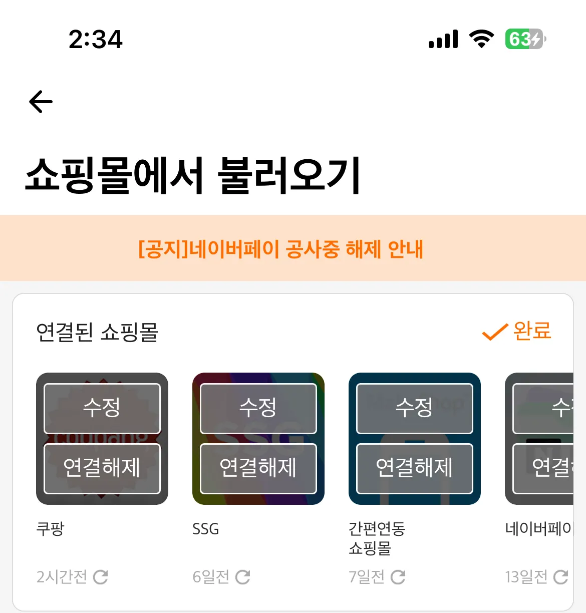연결한 쇼핑몰의 계정 수정 및 연결 해제 방법