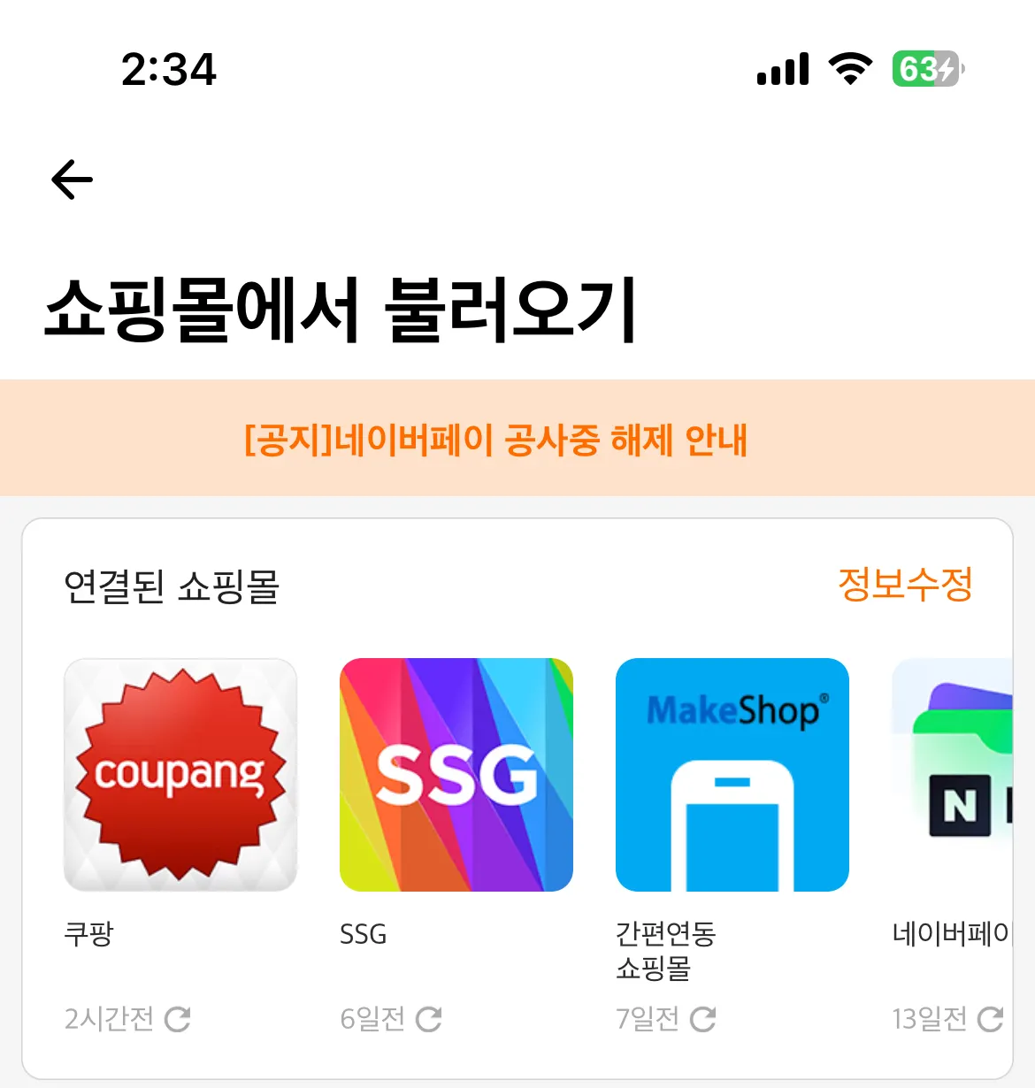 1) 연결된 쇼핑몰 부분의 우측의 ‘정보수정’ 을 탭 해주세요.