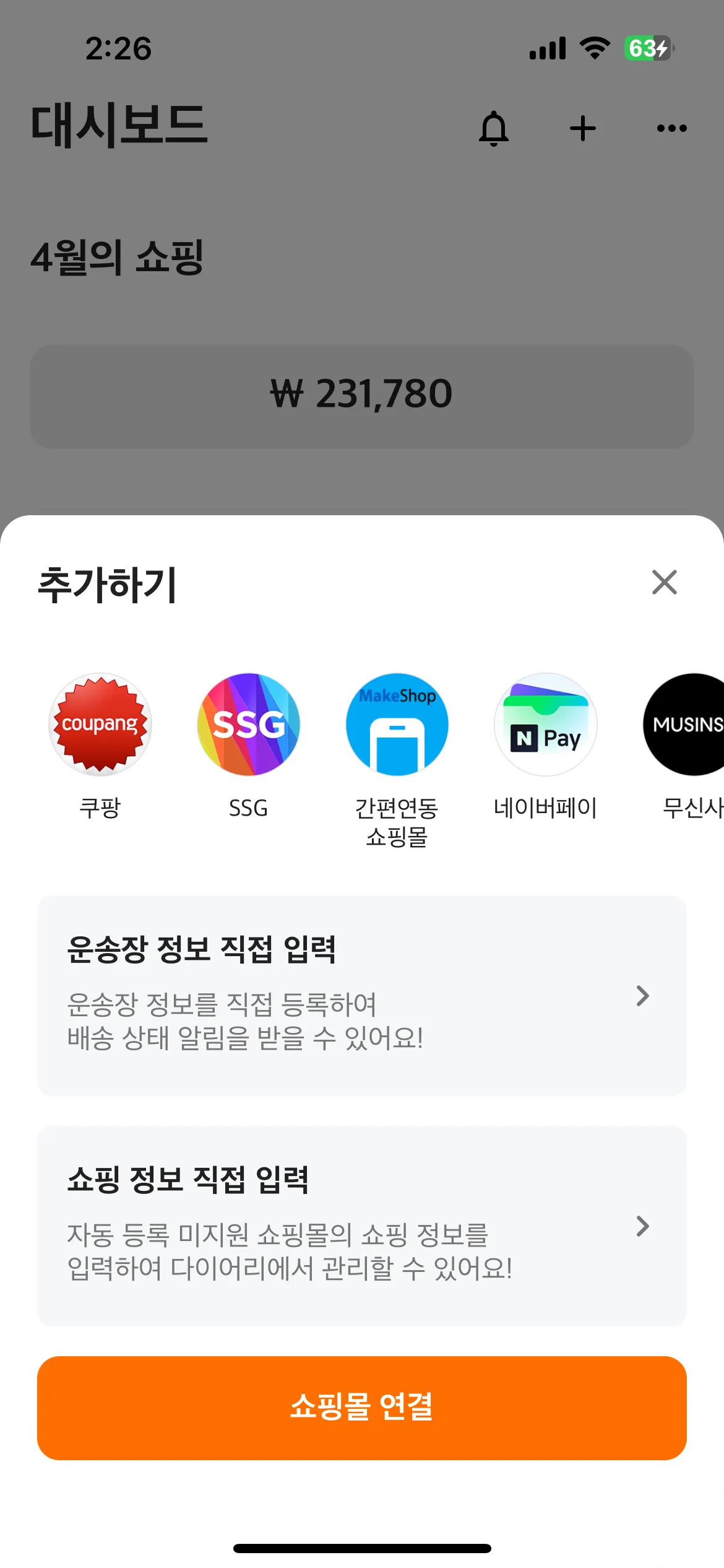 아쉽게도 iOS의 경우에는 OS에서 백그라운드 작업을 지원하지 않아 쇼핑몰의 주문내역과 동기화를 위해 사용자의 액션이 필요합니다. (쇼핑몰 로고를 탭하여 동기화)