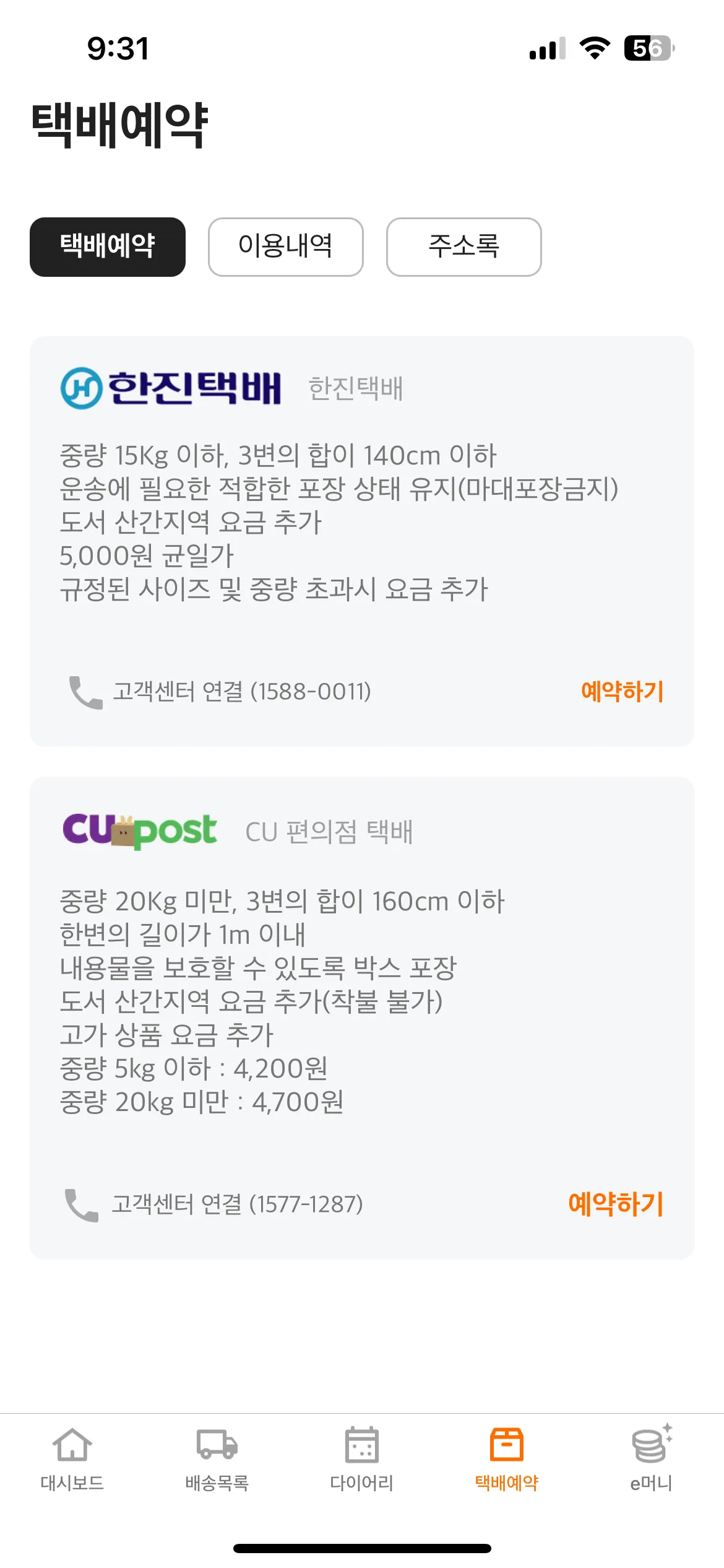 편리하게 한진택배와 CU편의점 택배의 예약을 하실 수 있는 기능입니다.