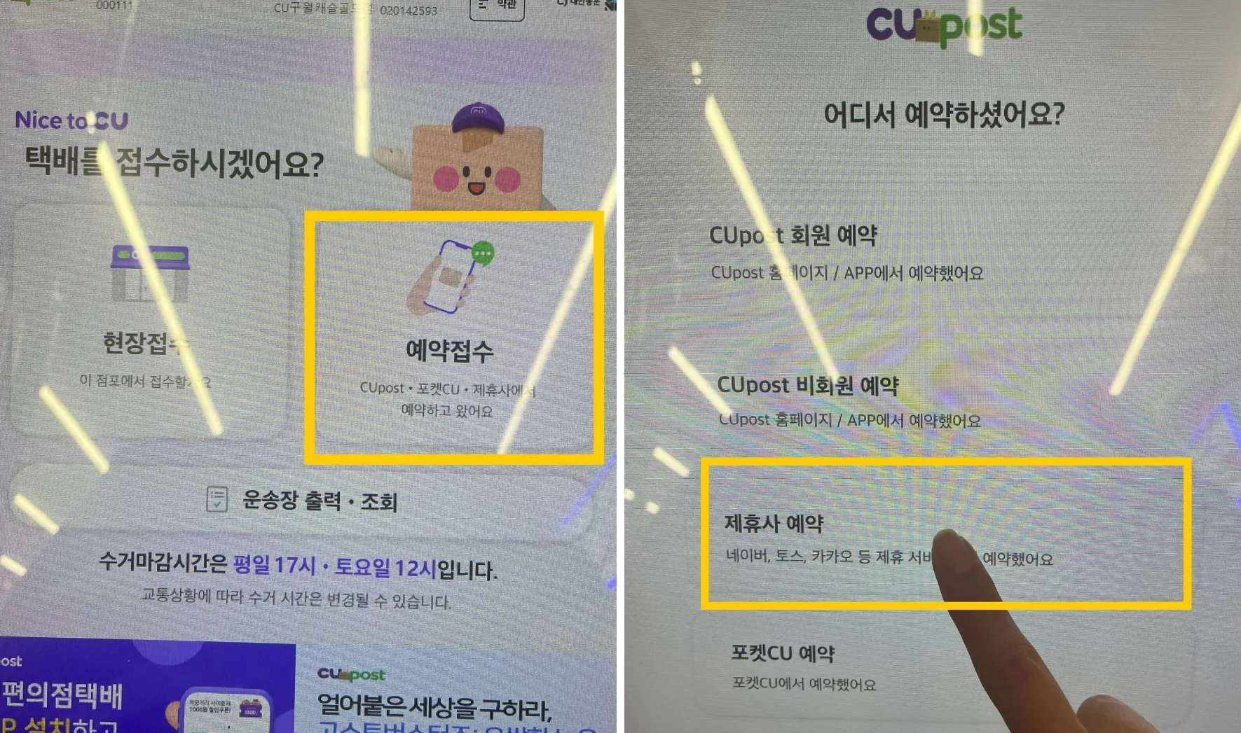 ① 예약 진행 후 가까운 택배 취급 CU편의점에 방문하시어 접수 단말을 통해 [예약접수 → 제휴사 예약]을 선택해 주세요.