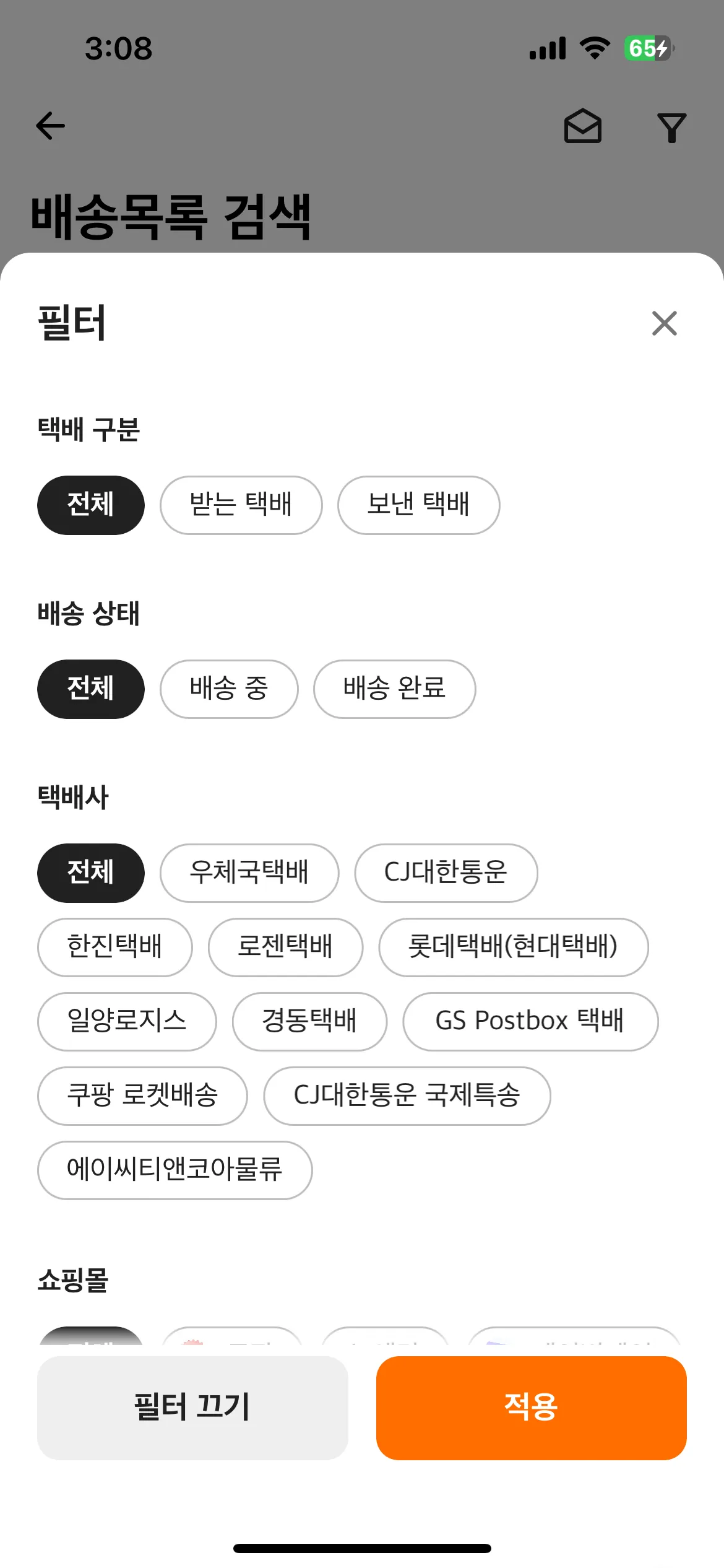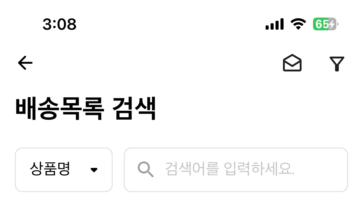 배송 목록 우측 상단의 돋보기 아이콘을 탭하여 나타나는 화면에서 검색이 가능하고, 필터 기능을 이용하여 좀 더 상세한 조건으로 검색이 가능합니다.