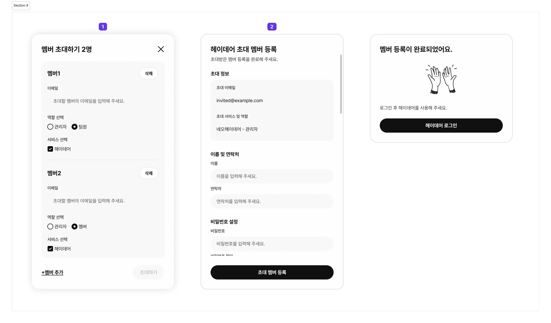 이 후 [멤버관리>초대하기]기능을 통해 관리자와 팀원을 초대하고 함께 헤이데어 관리가 가능해요.