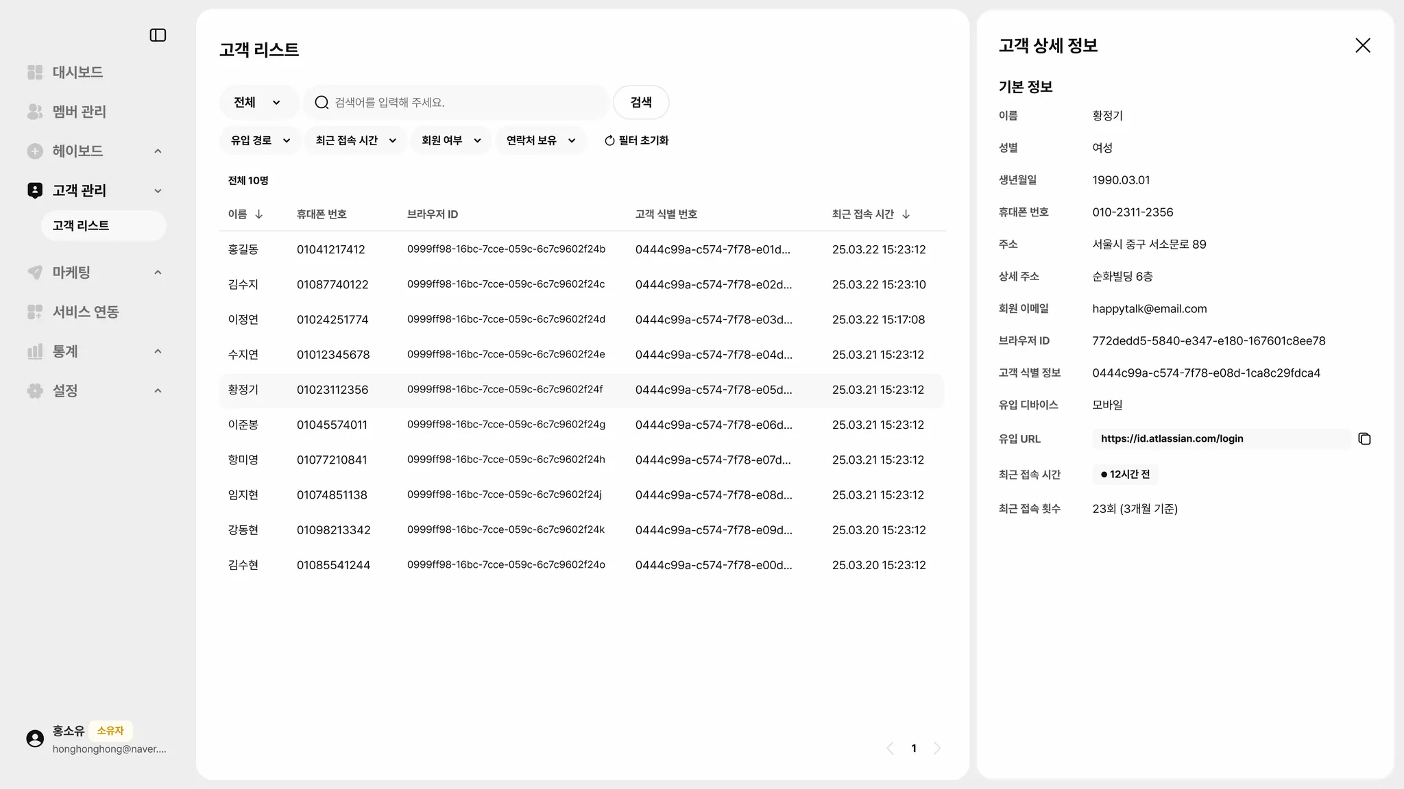헤이데어를 이용한 고객의 정보를 자동 수집하여 보여줘요. 추후 [해피톡] 등 다양한 서비스와 연동하여 고객의 상세 정보들을 추가하고, 적절한 CRM마케팅으로 매출 향상에 도움을 줄 수 있어요.