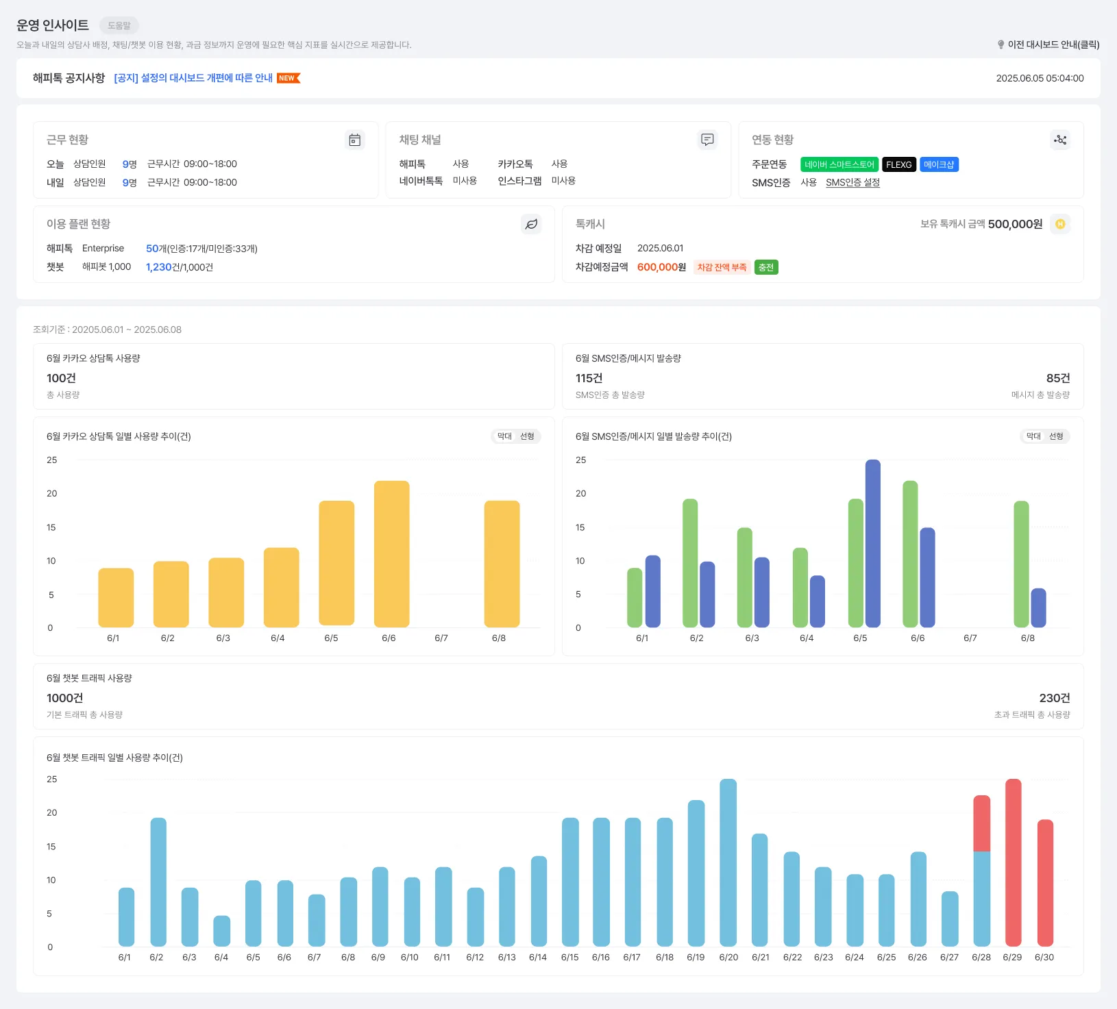 운영 인사이트 화면 최상단에서 해피톡 공지사항을 바로 확인할 수 있습니다.