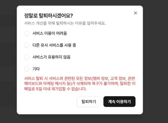 삭제된 데이터는 복구가 불가능하니, 탈퇴 전 꼭 신중히 결정해 주세요.