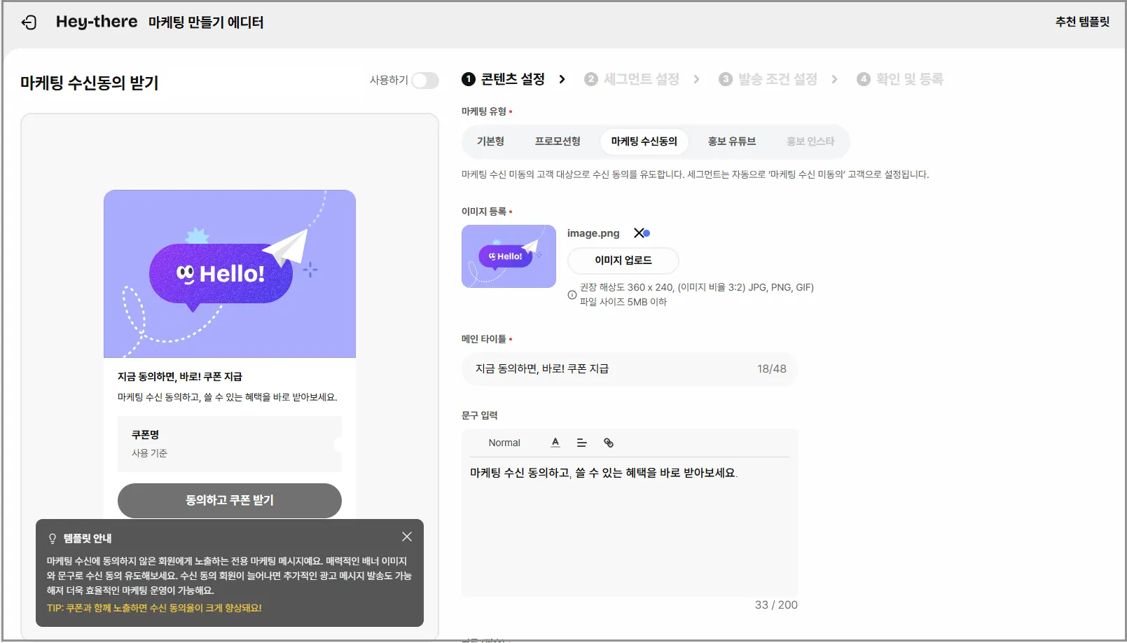 마케팅 수신에 동의하지 않은 회원에게 노출하는 전용 마케팅 메시지예요. 매력적인 배너 이미지와 문구로 수신 동의 유도해보세요.