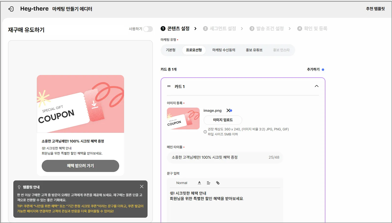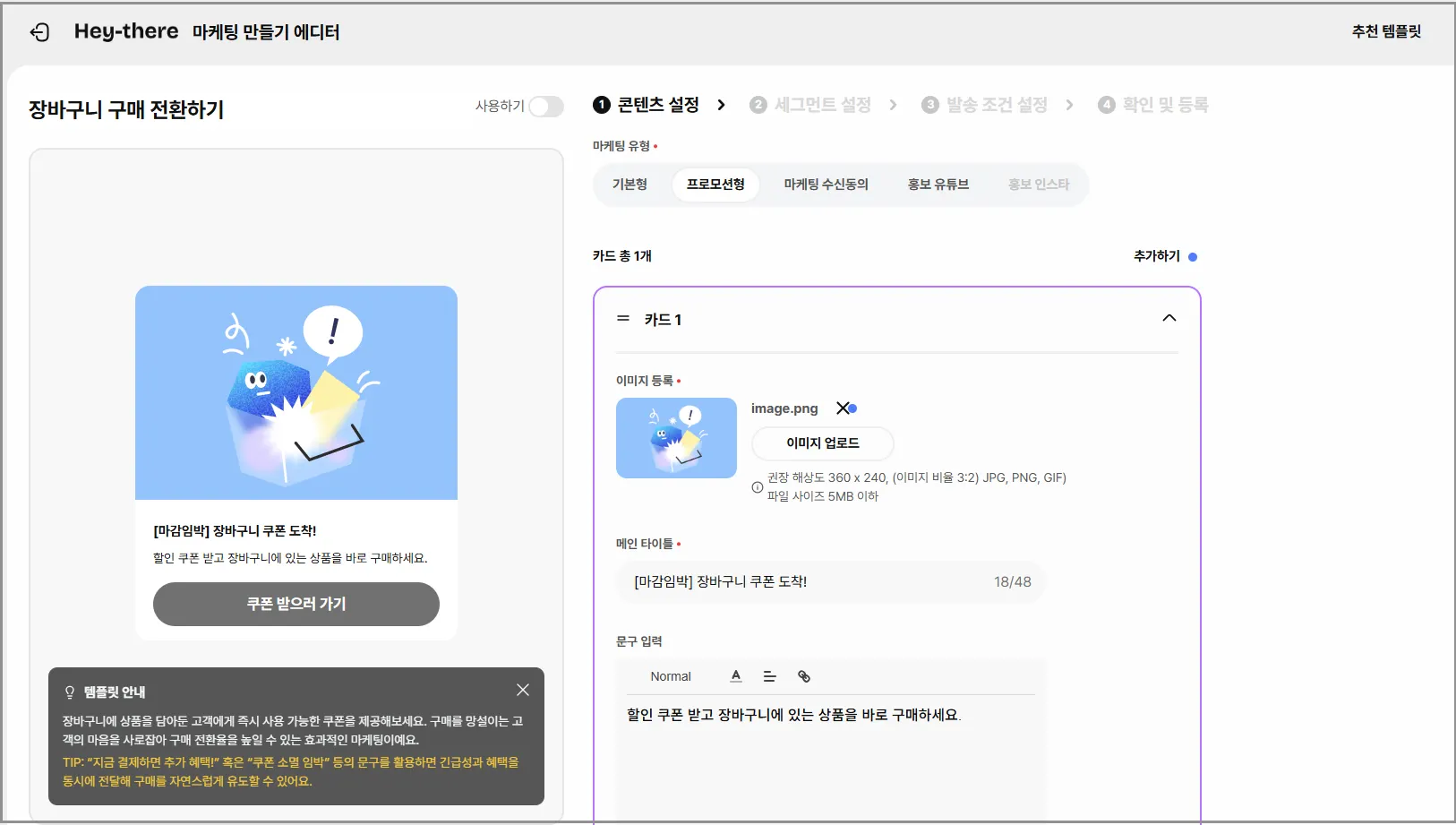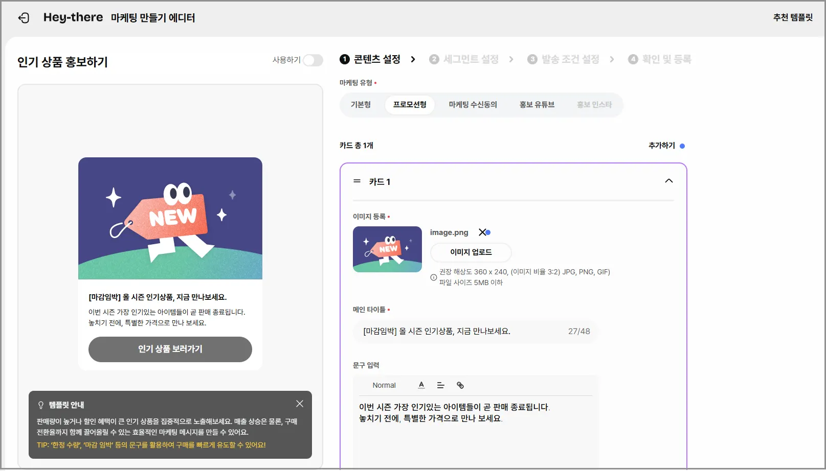 추천 템플릿(아래 타입 확인)을 선택하면 알맞은 [이미지]와 [내용]이 자동으로 들어가져요.