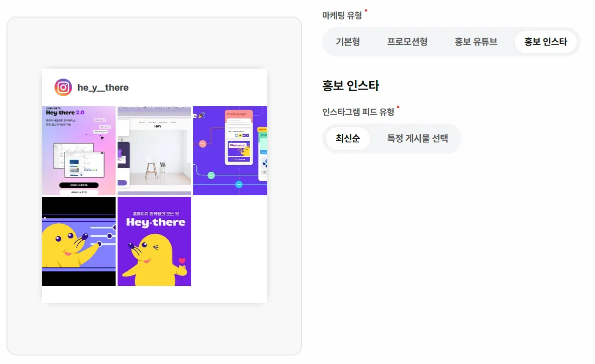 인스타그램 피드 유형: [최신순]으로 전체 피드를 노출하거나, 특정 선택된 게시물만 노출할 수 있어요.