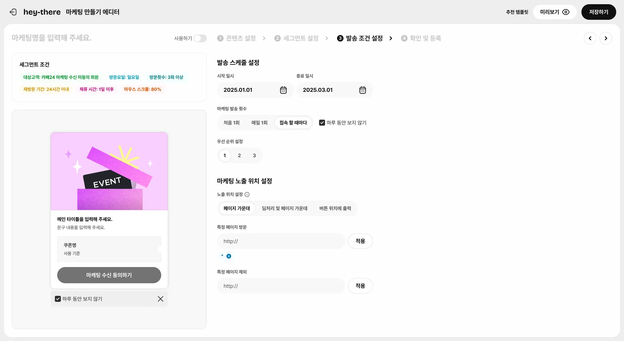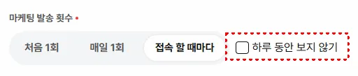 마케팅 발송 횟수: 처음 1회만, 매일 1회, 접속할 때마다 발송되도록 설정할 수 있어요.
