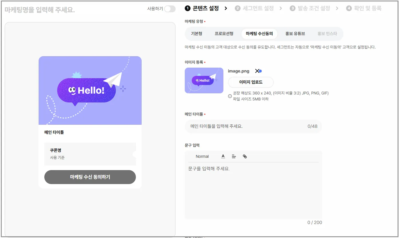 [마케팅 유형>마케팅 수신동의]일 경우 대상고객은 ‘카페24 [마케팅 수신] 미동의 회원’으로 고정되요.