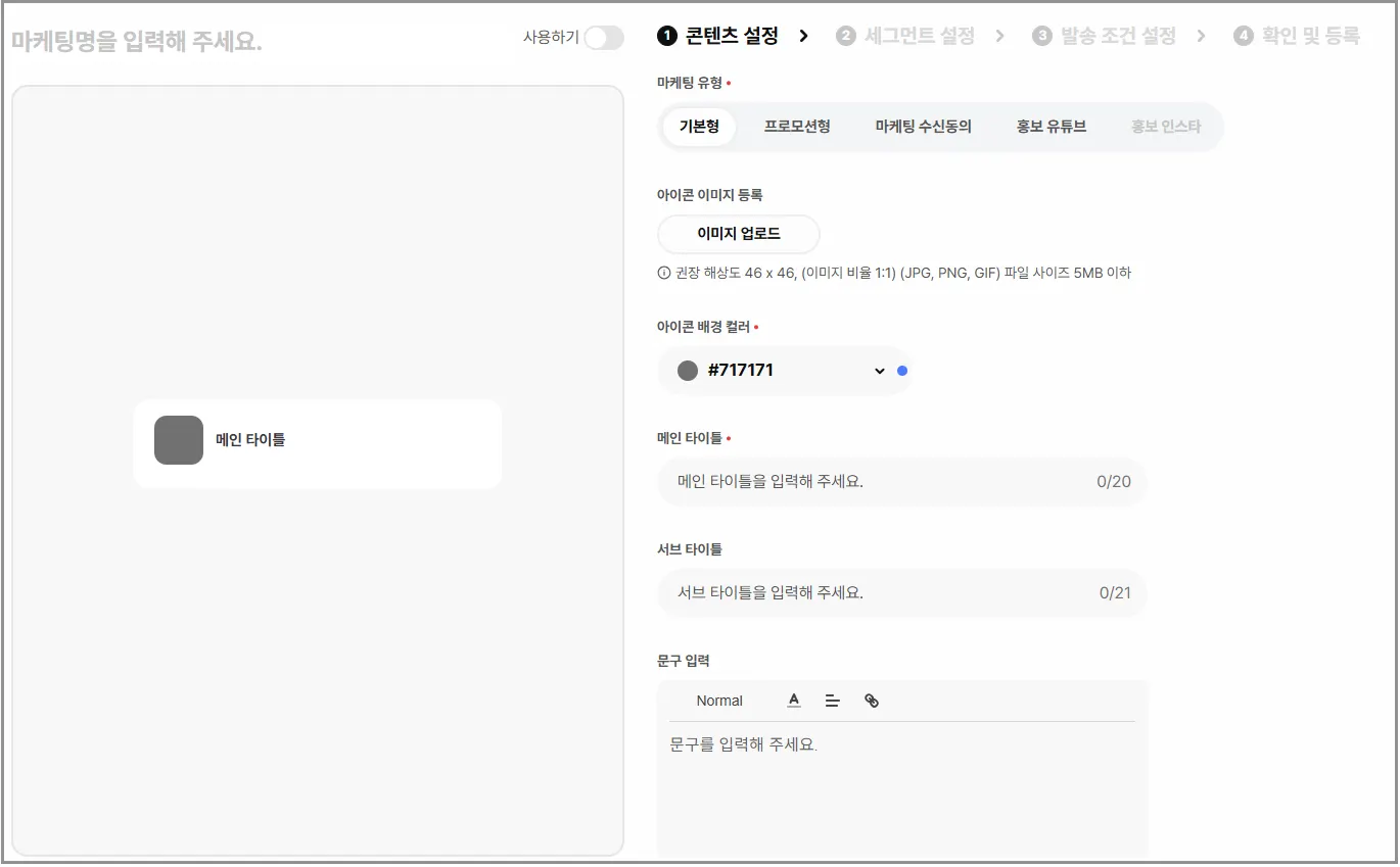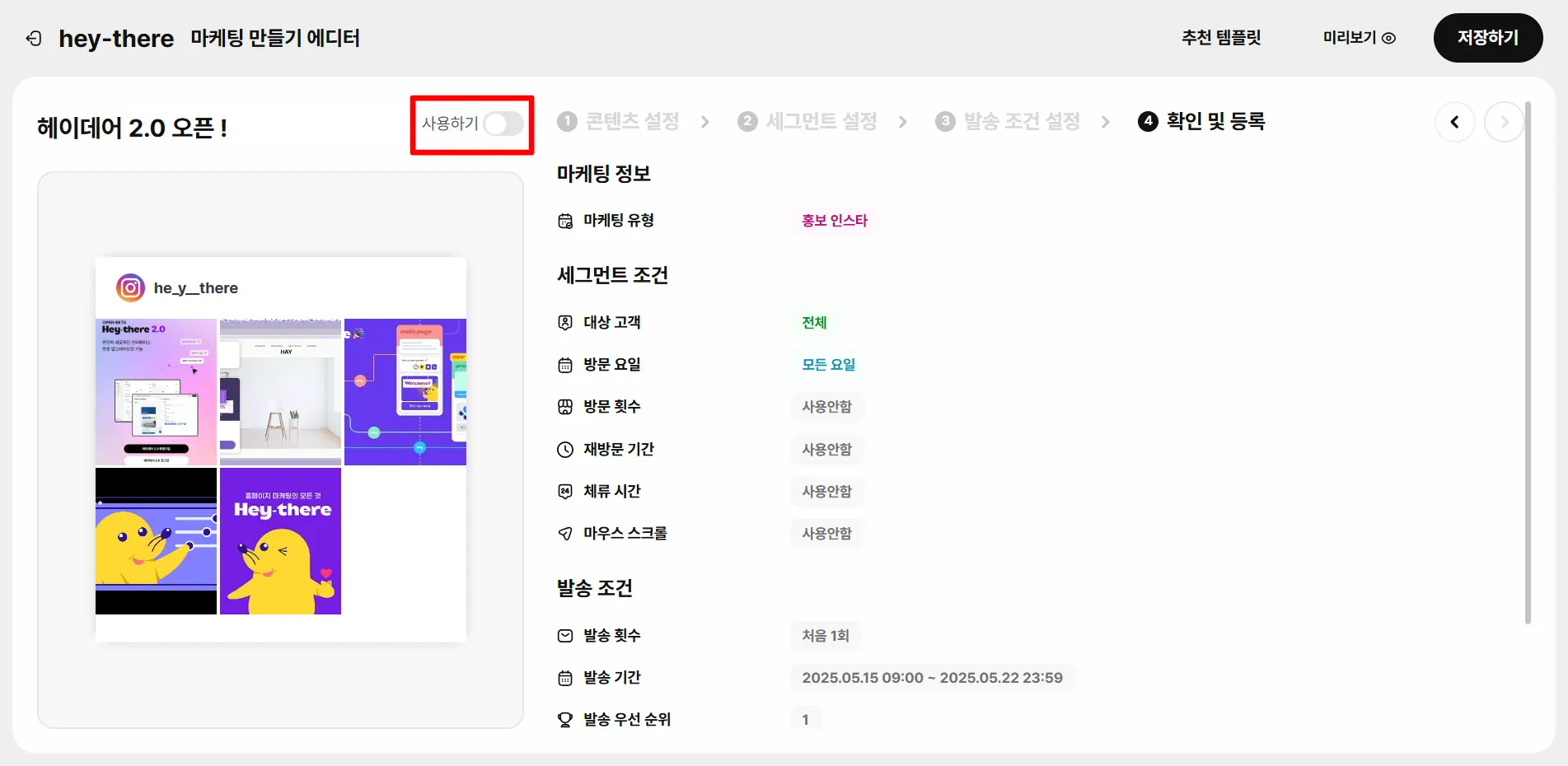 지금까지 설정한 정보들을 최종 확인 후 상단에 [저장하기]버튼을 눌러 최종 마케팅을 발송해 보세요. 단, 꼭 [사용하기]버튼을 ON 시켜주셔야 정상적으로 마케팅 메시지가 노출돼요.