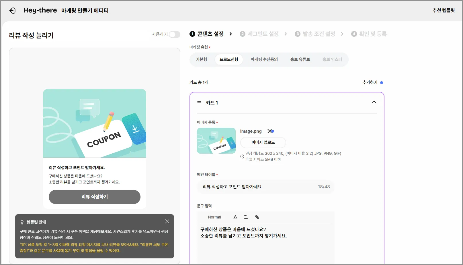 구매 완료 고객에게 리뷰 작성 시 쿠폰 혜택을 제공해 보세요.