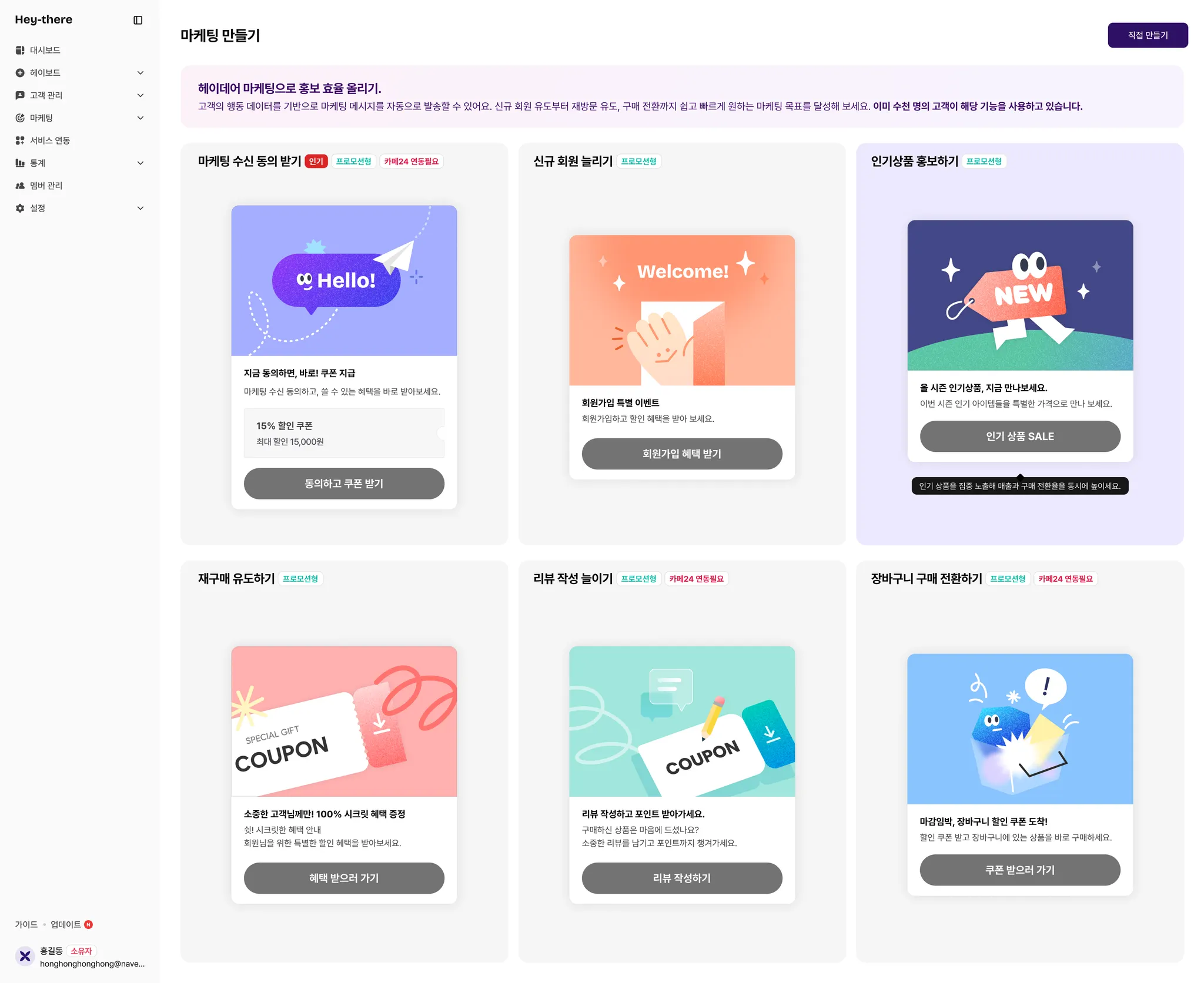 원하는 추천 템플릿이 없다면 상단에 [직접 만들기]를 통해 원하는 마케팅을 만들 수 있어요.