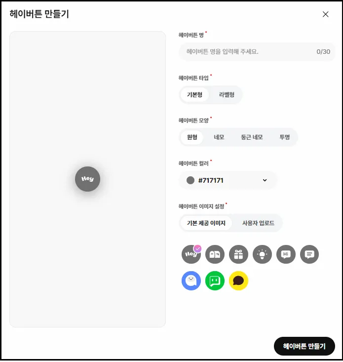간단하게 ‘헤이버튼 명’만 입력하고 좌측 보여지는 버튼 이미지로 바로 만들기 가능해요.
