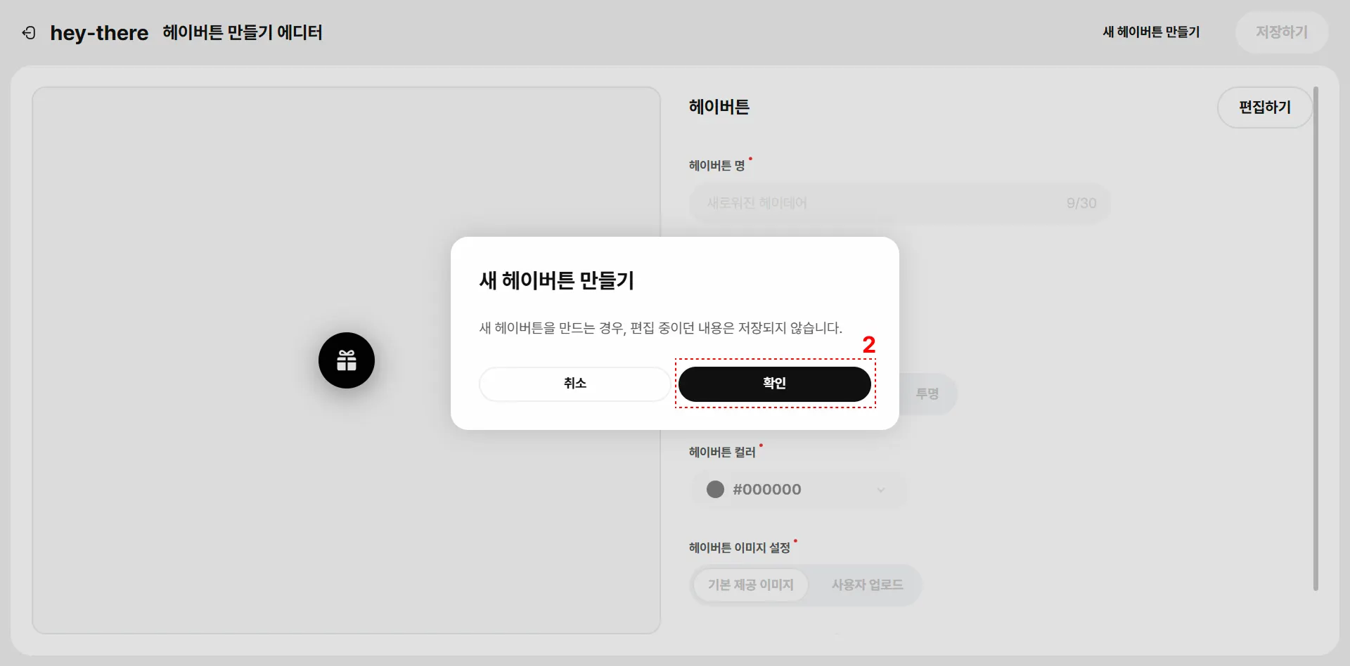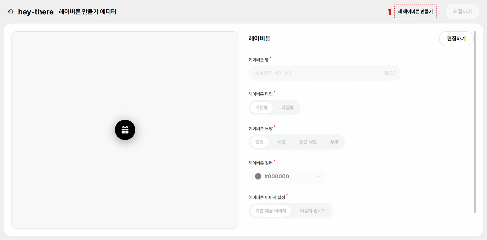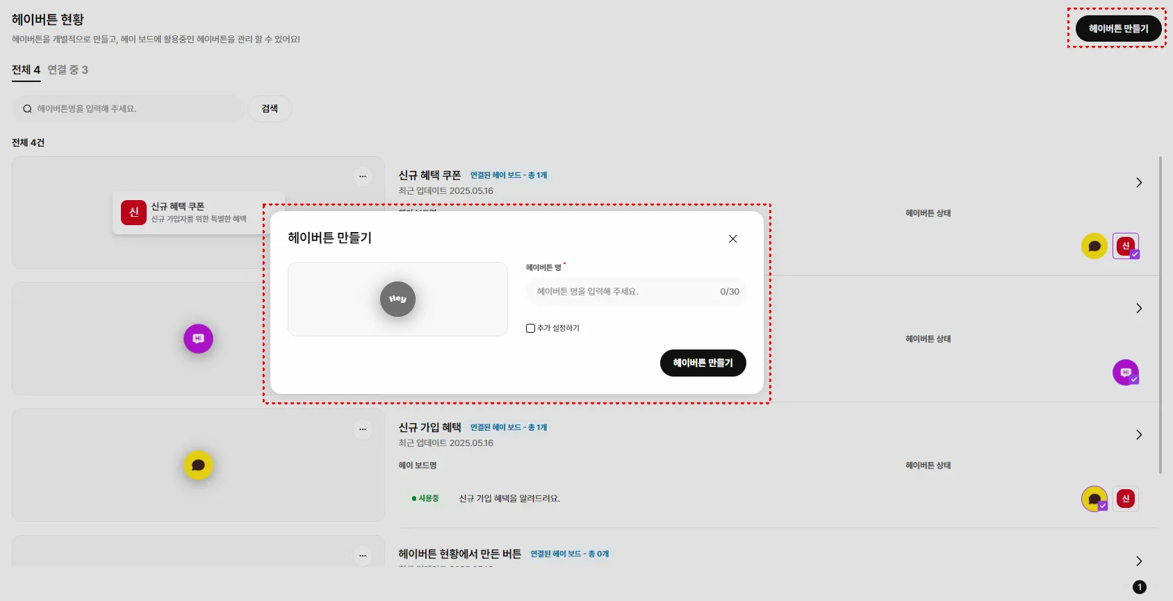 우측 상단의 [새 헤이버튼 만들기] 버튼을 클릭하면, 새 헤이버튼을 생성할 수 있어요.