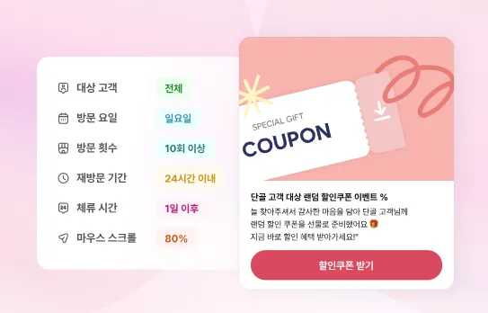 활용 예시: 첫 방문자에게 환영 메시지, 장바구니 이탈자에게 할인 쿠폰 제공 등
