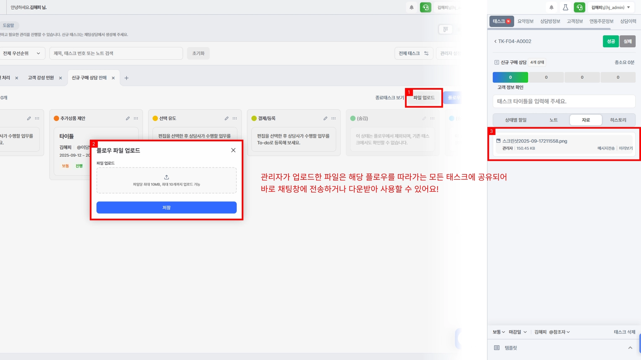 플로우별로 상담에 필요한 자료를 업로드할 수 있습니다.