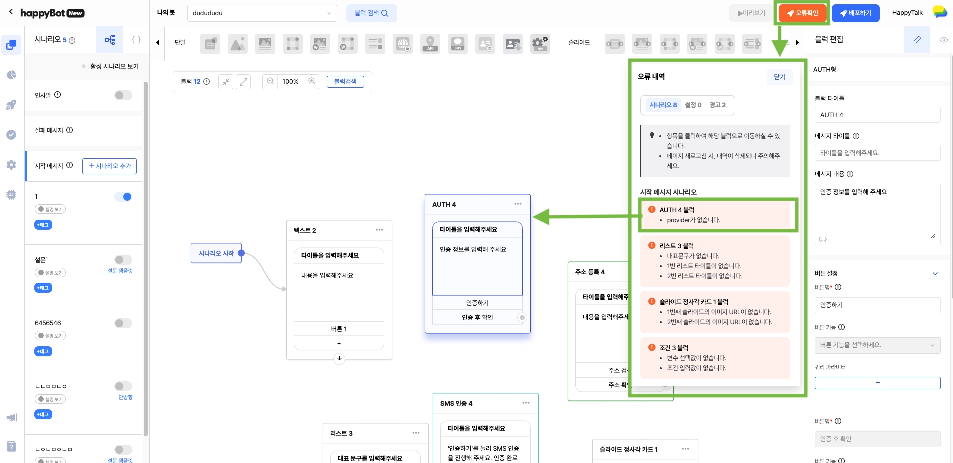 시나리오/설정의 오류는 반드시 수정해주셔야만 배포 진행에 문제가 생기지 않습니다.