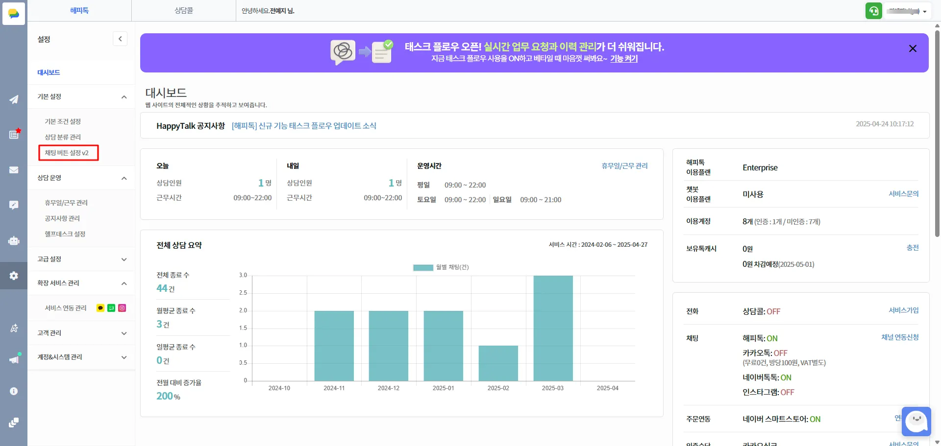 [해피톡 접속>설정 > 채팅 버튼 설정 v2] 메뉴 접속