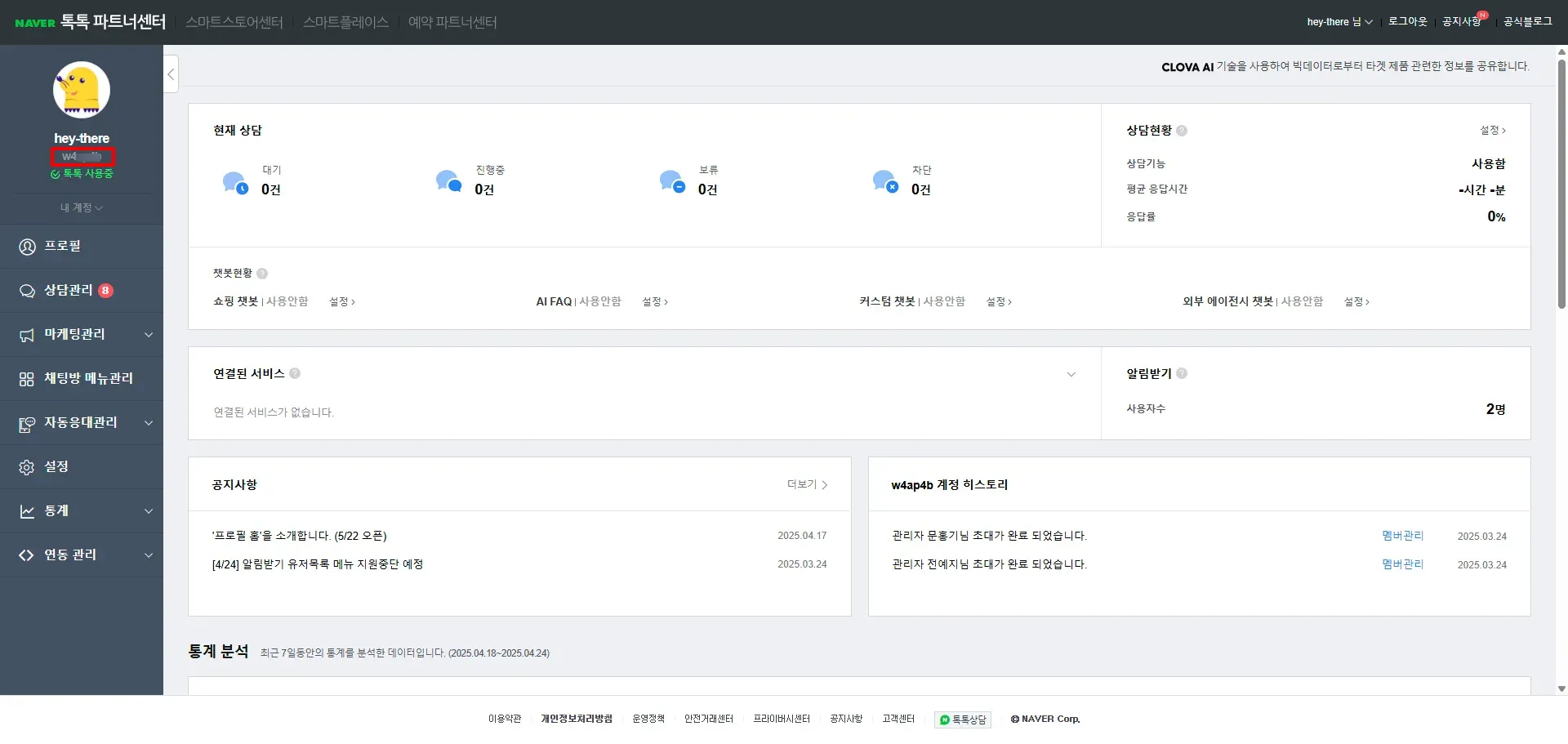 네이버톡톡 파트너센터에 접속 후, 왼쪽 상단 프로필 영역의 영문으로 노출되어 있는 파트너 ID를 확인해보세요. 네이버톡톡 파트너센터 바로가기