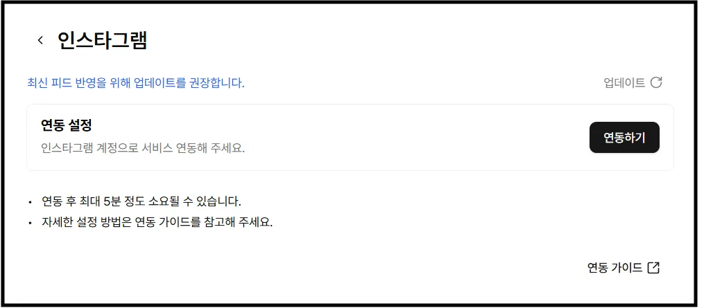 [연동하기]를 눌러 인스타그램 로그인 및 권한 승인을 해주시면 연동이 완료돼요.