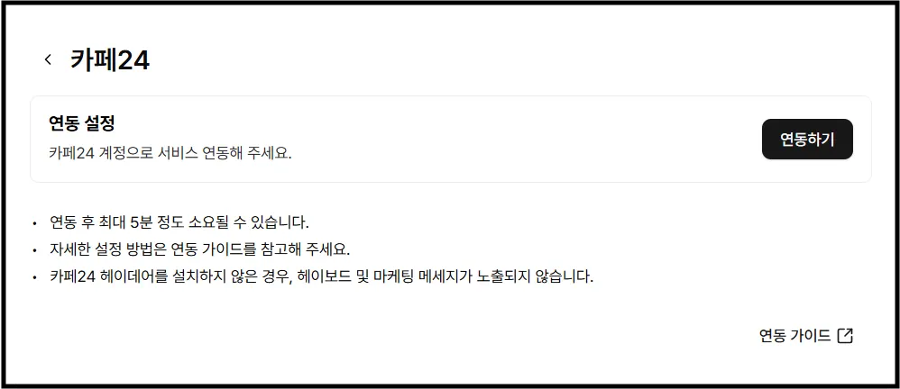[연동하기]버튼을 클릭 후 연동할 카페24 쇼핑몰 ID를 입력해주세요. 카페24 연동방법 상세보기
