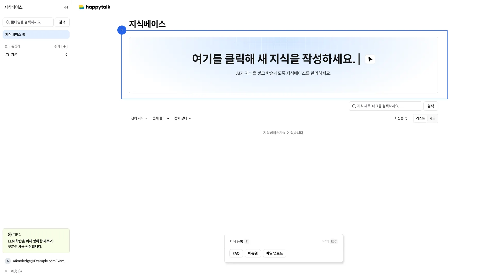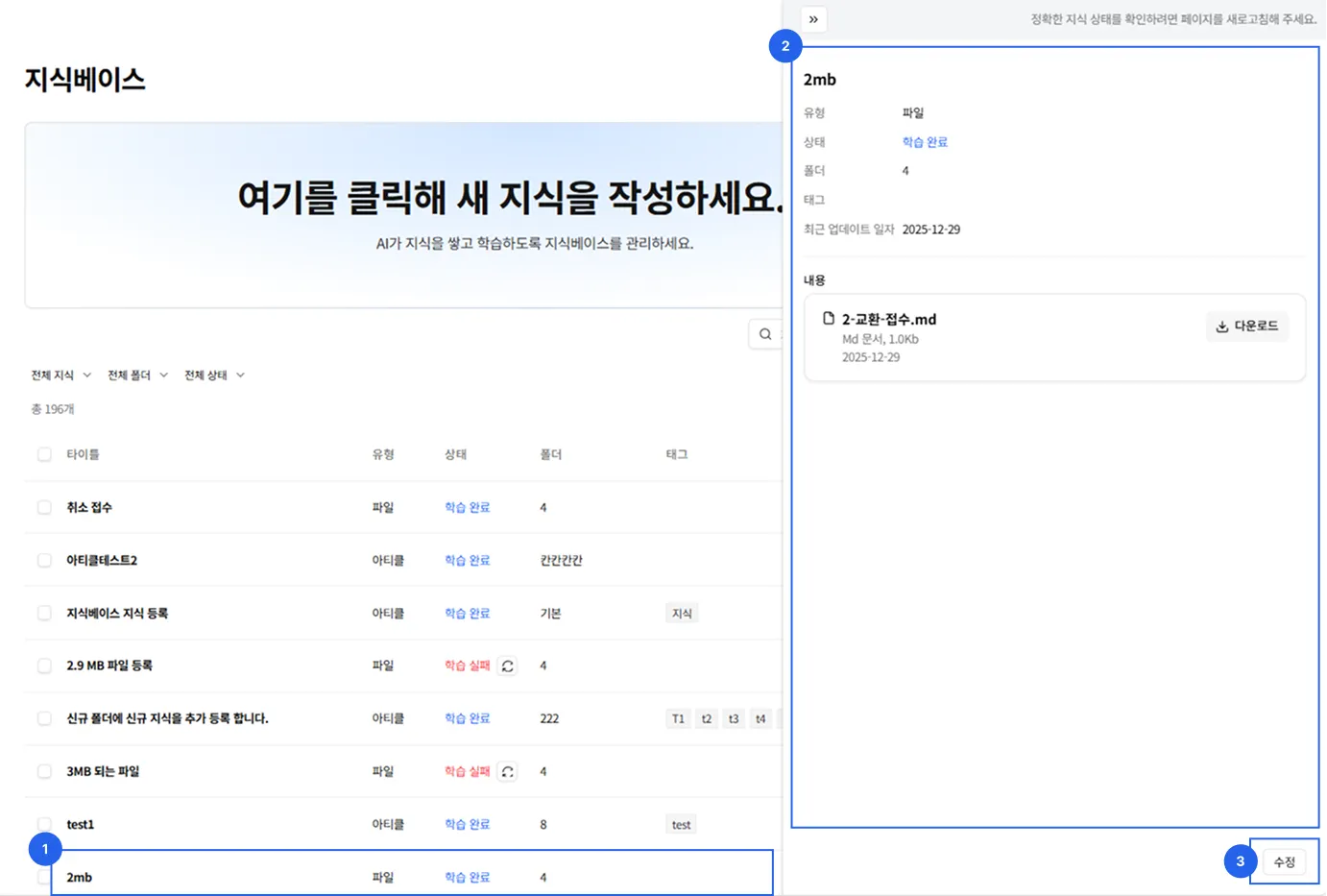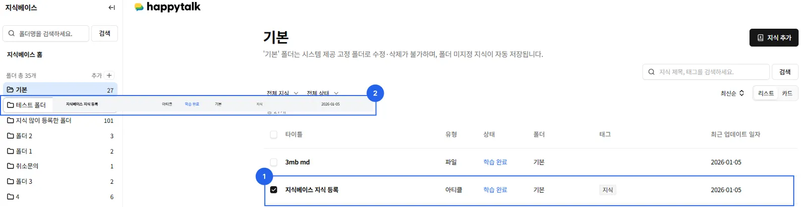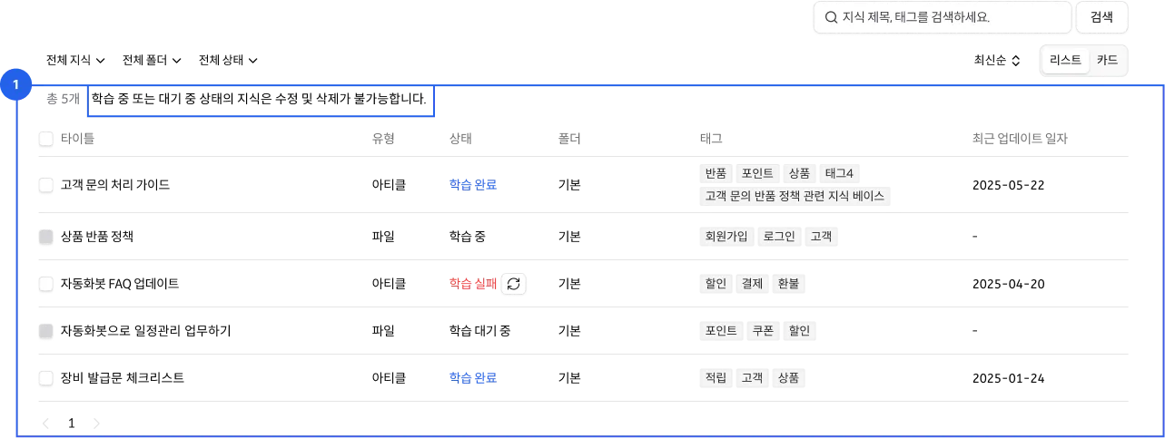 지식베이스에 등록된 모든 지식을 조회하고 관리할 수 있습니다.