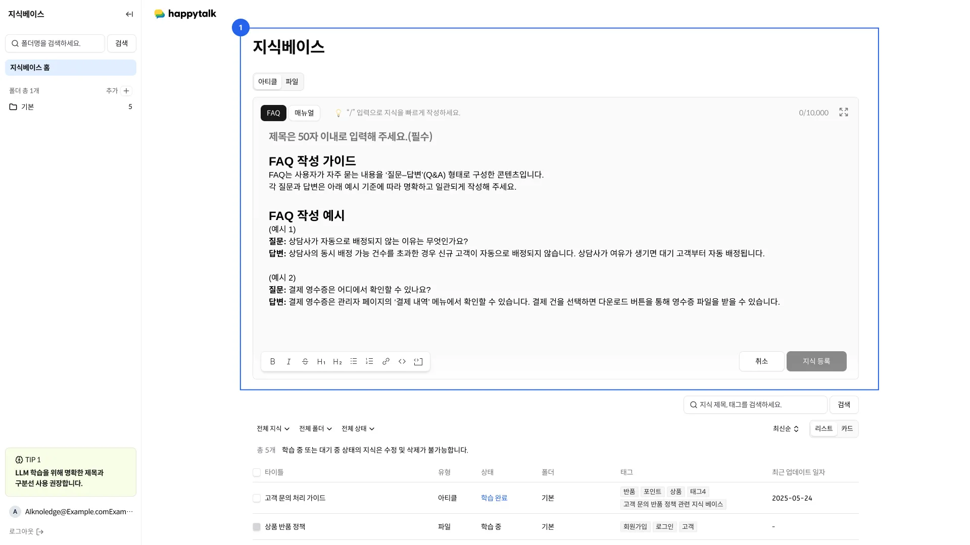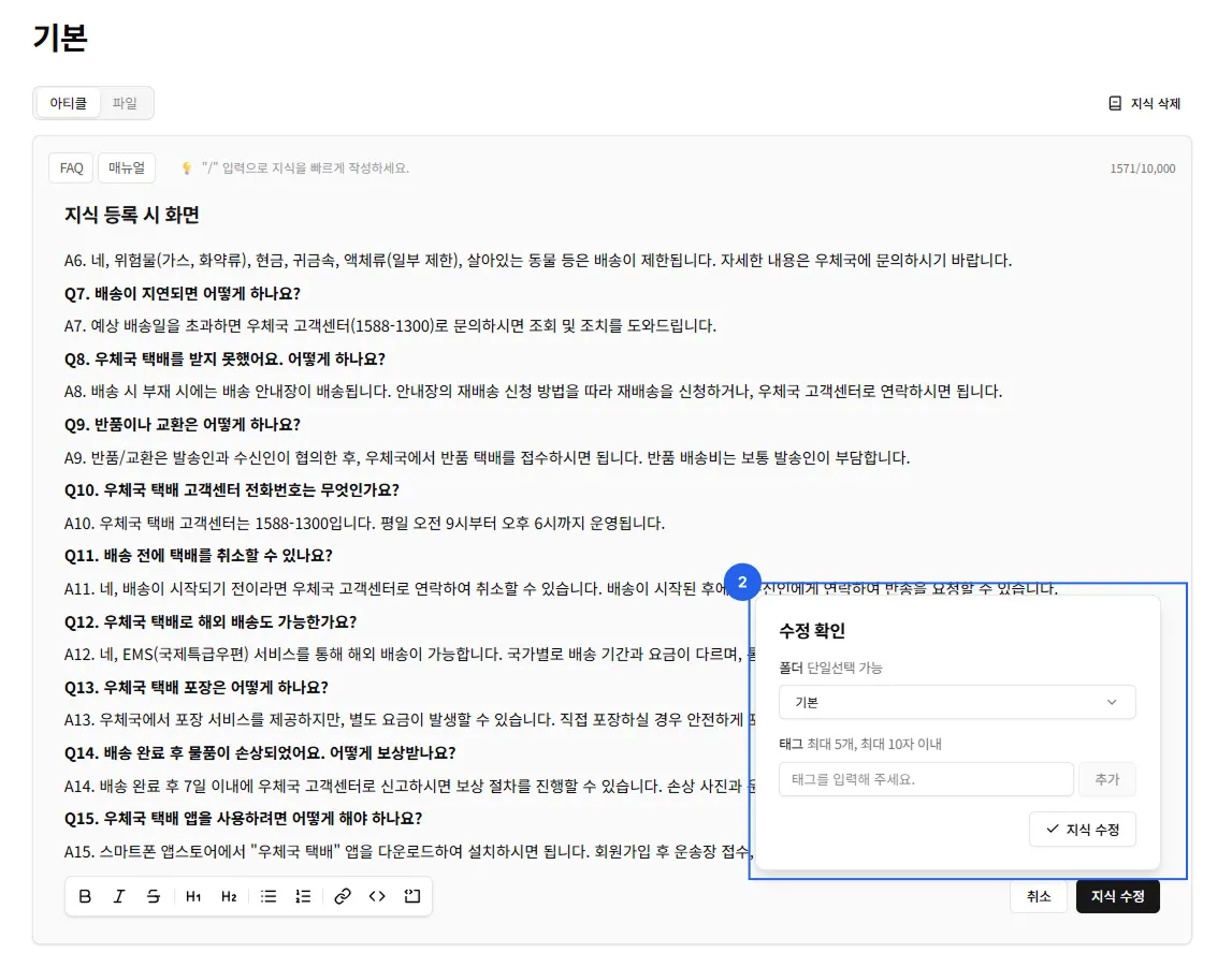 이곳에 등록한 지식은 AI 응답 생성에 활용되어, 보다 정확한 답변을 제공하는 데 도움을 줍니다.