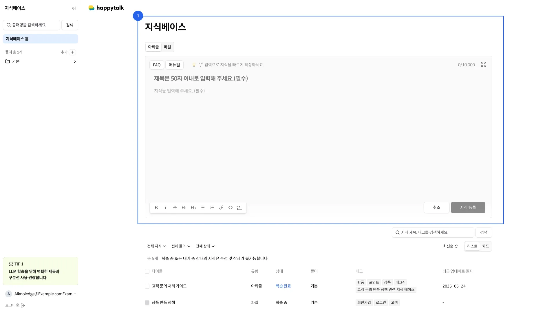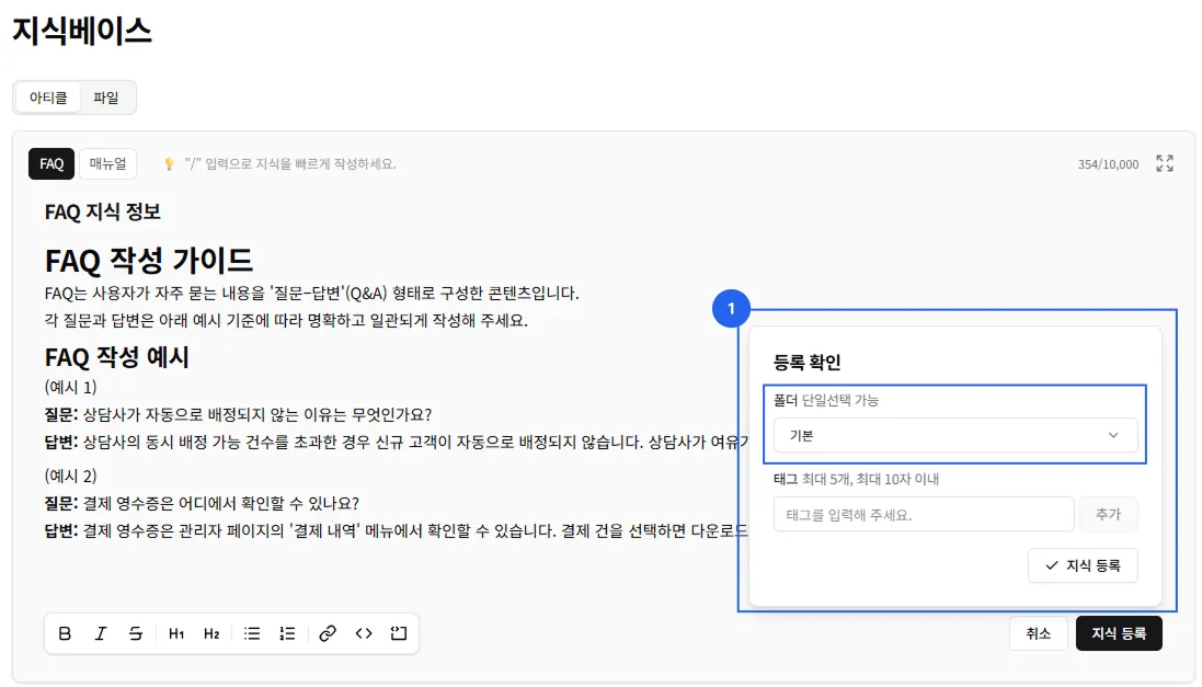 지식베이스는 아티클과 파일 업로드 유형으로 지식을 등록할 수 있습니다.