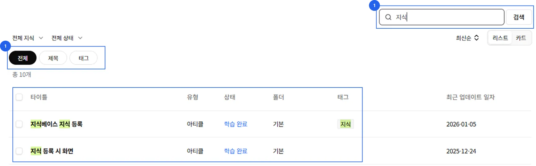 지식 목록은 리스트형과 카드형 UI를 제공합니다.