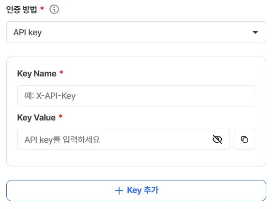 Key Name | - API 요청 헤더에 포함될 인증 변수명입니다.- 영문으로 시작해야 하며, 영문·숫자·밑줄(_), 하이픈(-)만 입력 가능 |