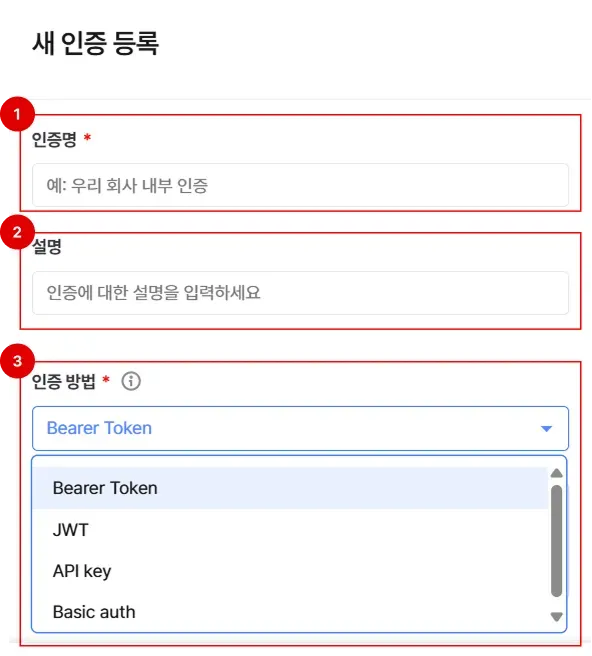 - Bearer Token, JWT, API Key, Baic Auth 방식 지원 |
