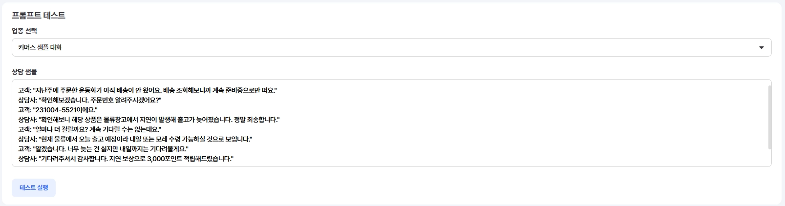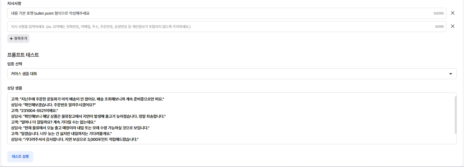 진행 중 상담 요약과 동일하게 설정하고 테스트할 수 있습니다.