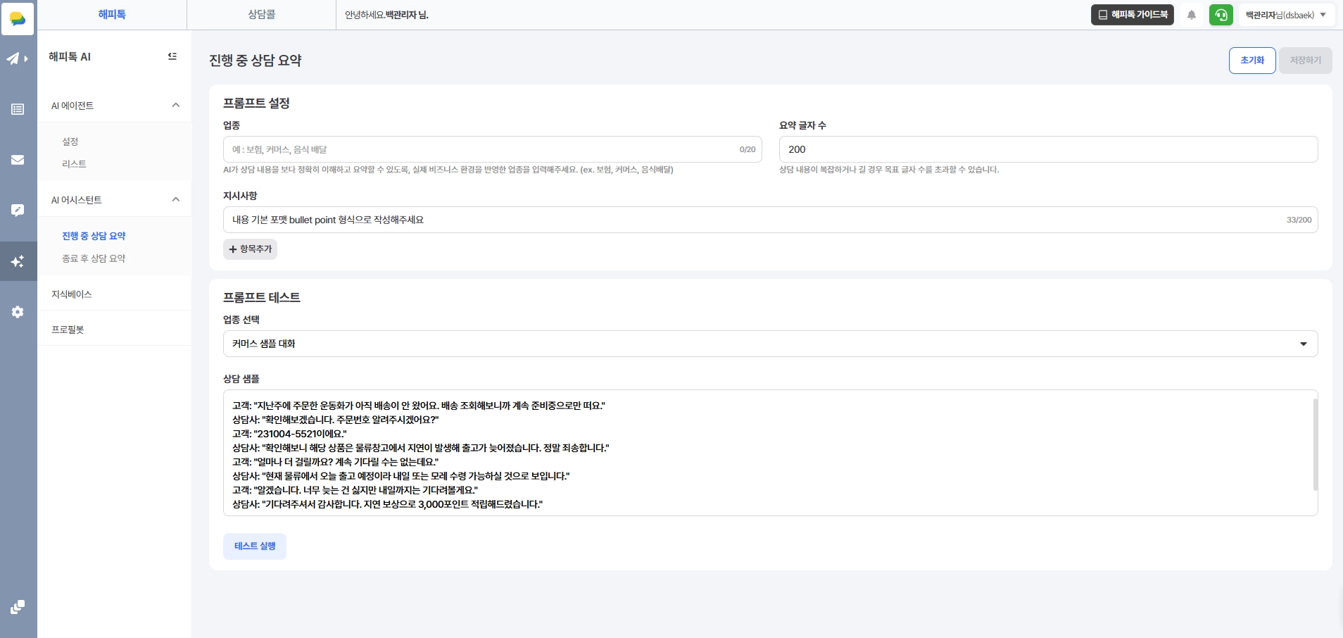 해피톡 AI > AI 어시스턴트 > 진행 중 상담 요약
