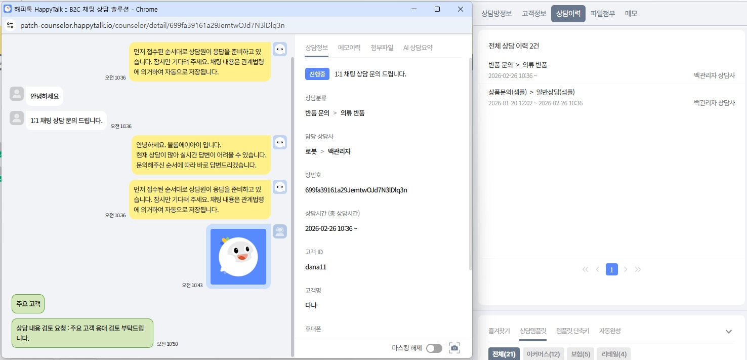 동일한 고객 ID 기준으로 과거 상담 내역이 자동 연동되어 표시됩니다.
