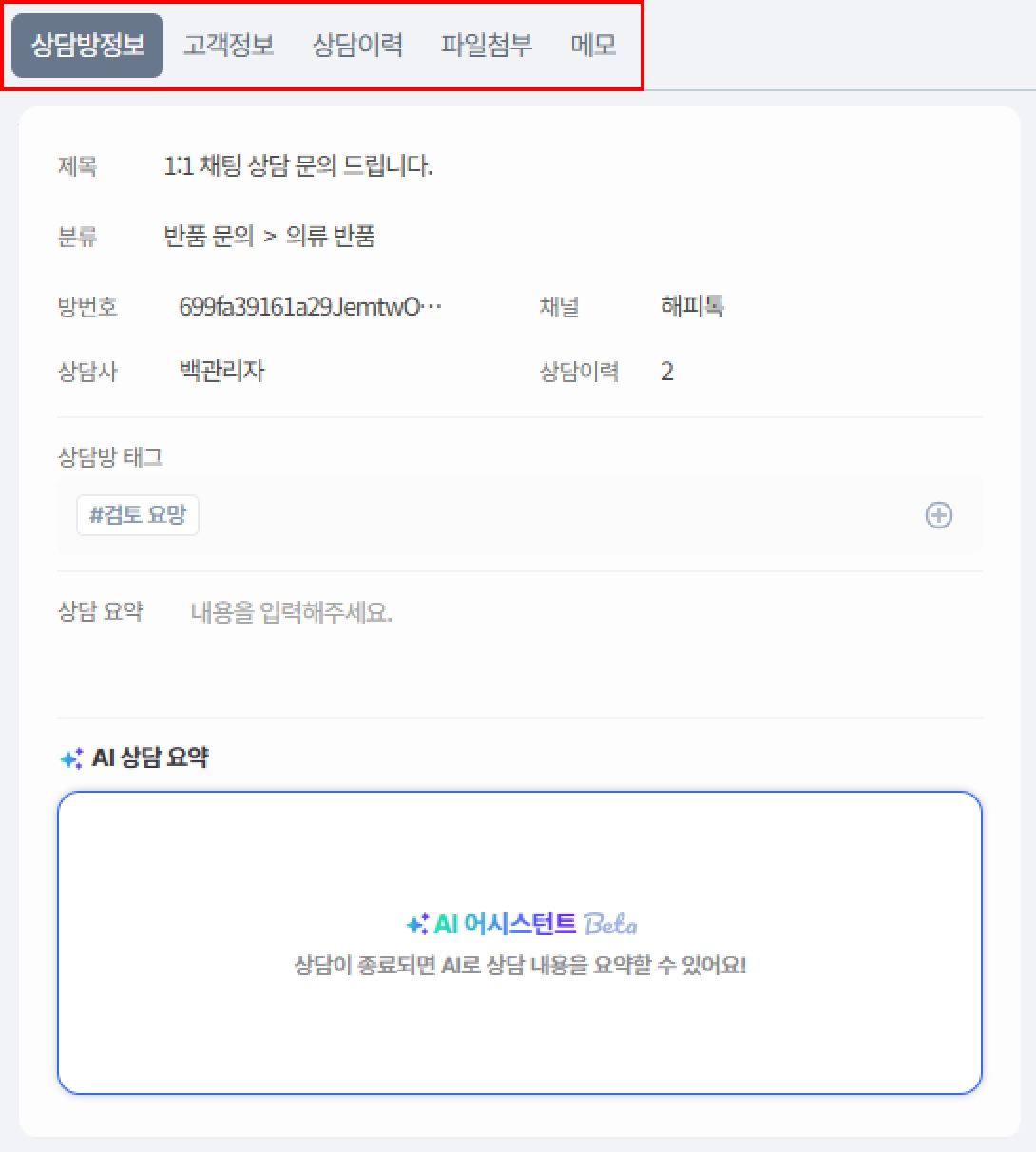 아래와 같이 상담방 정보 / 고객정보 / 상담이력 / 파일첨부 / 메모로 구성됩니다.