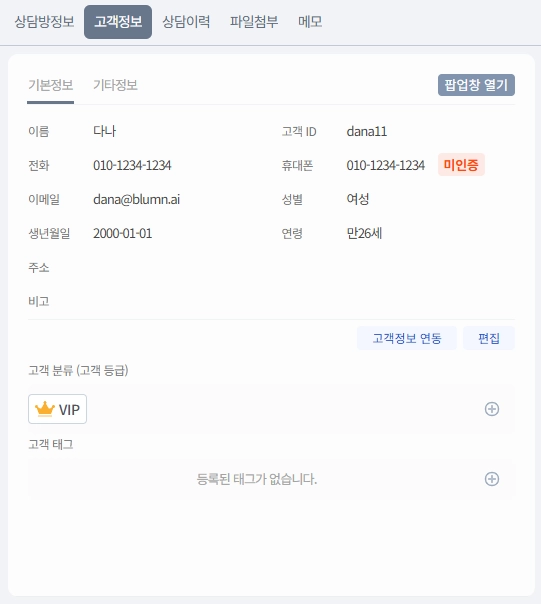 상담 중인 고객의 기본 정보를 확인하고 일부 수정할 수 있습니다.